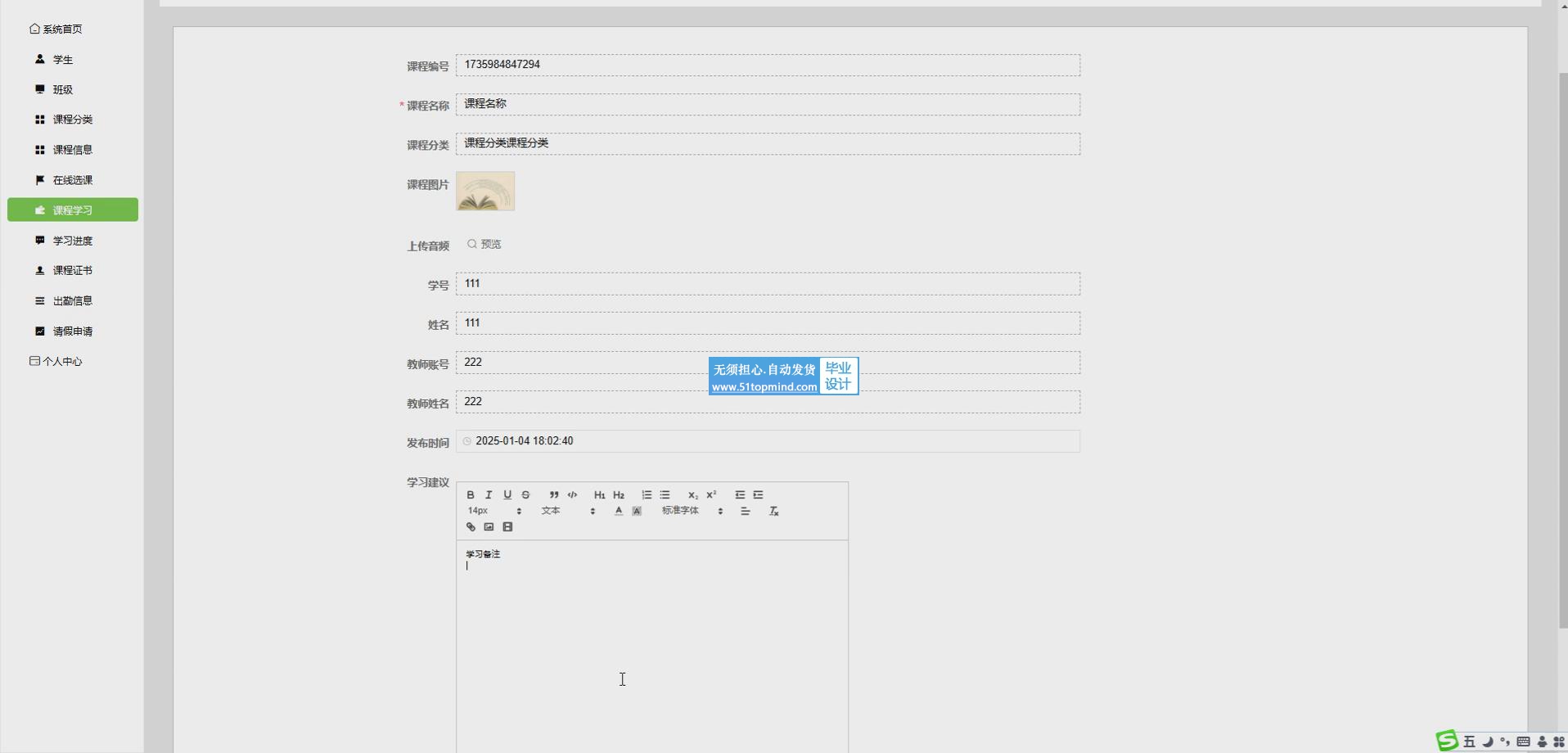 查勤管理系统的核心在于构建一个全面、高效的教育管理平台,旨在提升学校的教学质量和管理效率。系统功能涵盖了学生、教师、班级管理等多个方面,为学校提供了从基础信息管理到教学活动监控的全方位解决方案。通过学生和教师的信息管理,系统能够确保用户数据的准确性和安全性,为后续的教育活动提供坚实的基础。班级和课程分类管理功能则有助于学校更好地组织教学资源,提高教学效率。在线选课和课程学习功能为学生提供了自主学习的便利,使他们能够根据自己的兴趣和需求选择课程,系统能够实时跟踪学生的学习进度,为教师提供反馈。课程证书功能则为学生的学习成果提供认证,增强了学习的成就感。出勤信息和请假申请管理功能则确保了教学活动的有序进行,通过实时监控学生的出勤情况,及时处理请假申请,提高了教学管理的透明度和公正性。交流论坛和论坛分类功能为师生提供了一个互动交流的平台,促进了知识的分享和学术讨论。举报记录功能则有助于维护论坛的秩序,确保交流环境的健康。系统管理功能则为管理员提供了强大的后台支持,包括用户管理、数据备份、系统更新等,确保系统的稳定运行。整体而言,查勤管理系统不仅提升了学校的管理效率,还为师生提供了更加便捷、高效的学习和工作环境,推动了教育信息化的发展。通过这些功能的集成,系统能够满足学校在教学管理、学生学习和教师教学等方面的需求,为教育改革和创新提供了有力的支持。