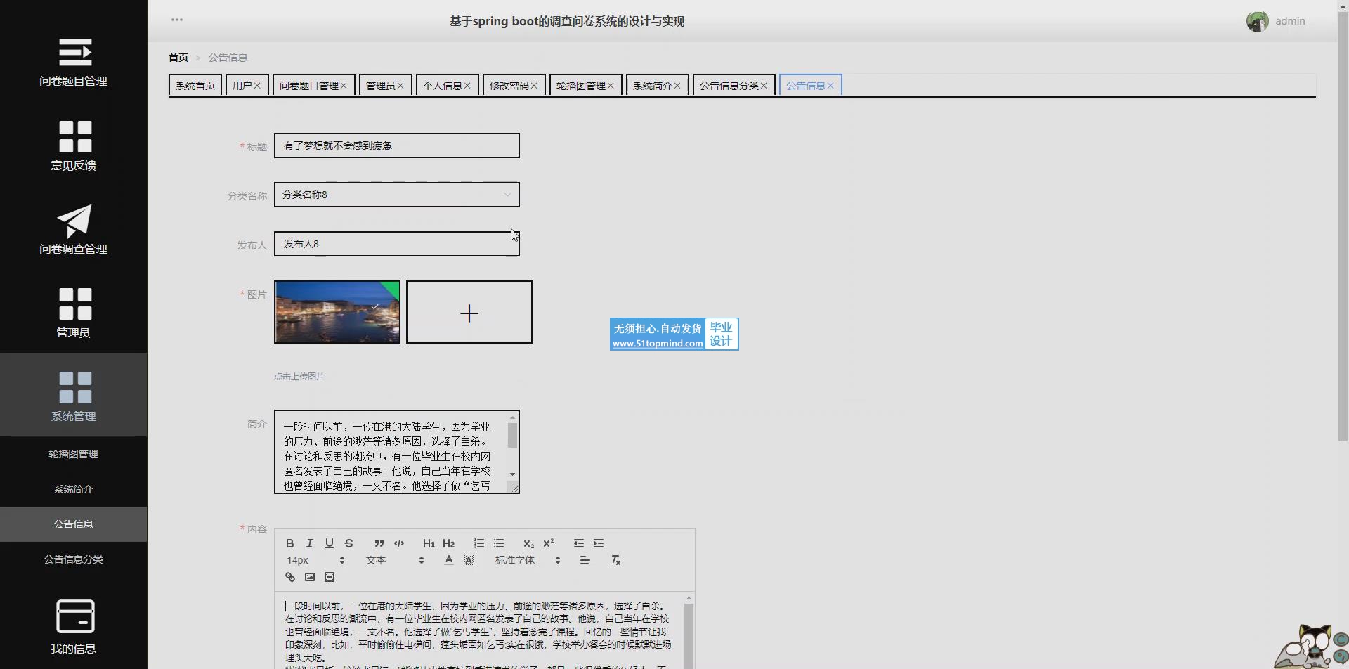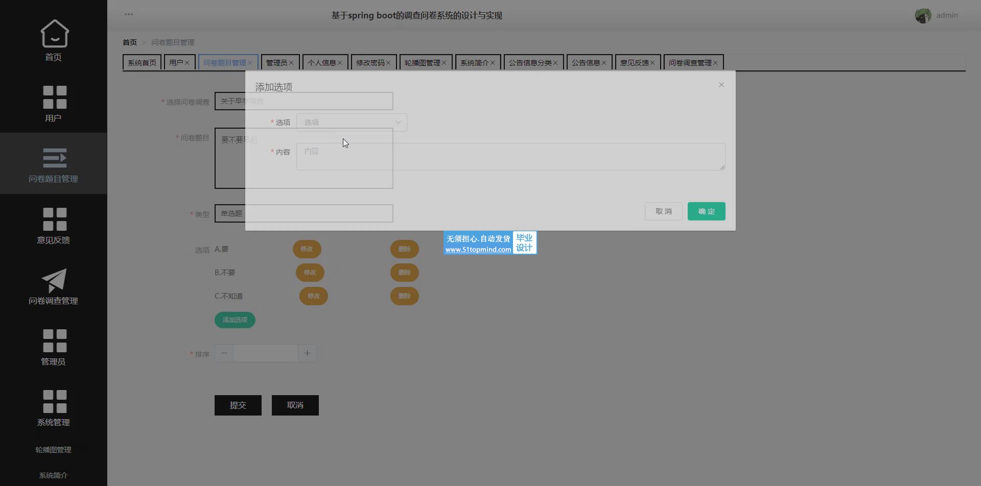 系统设计上,我们区分了管理员与用户两种角色,涵盖了用户管理、问卷题目的创建与维护、意见反馈收集、问卷调查的发布与监控、系统设置以及个人信息管理等多个功能模块。这样的结构设计旨在提供清晰的使用路径和高效的数据处理流程,以满足不同用户的使用需求并提升整体的系统性能。