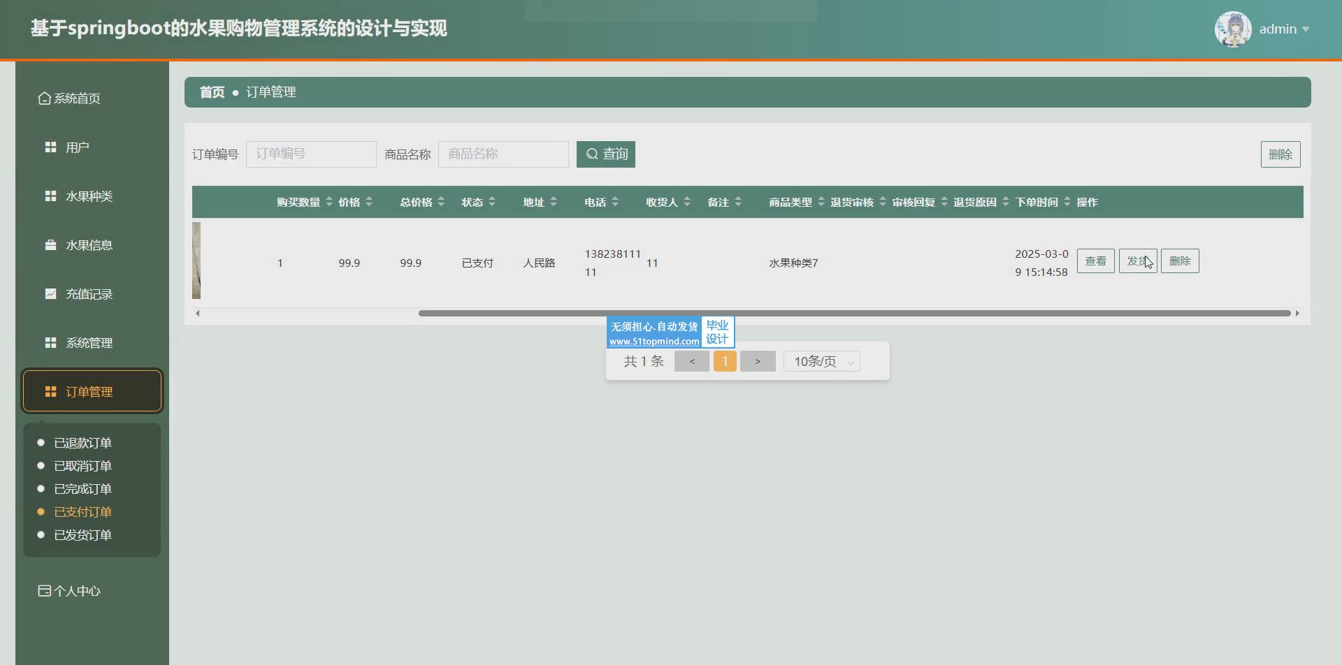 水果订单管理:管理员可管理用户购买订单并进行审核发货。