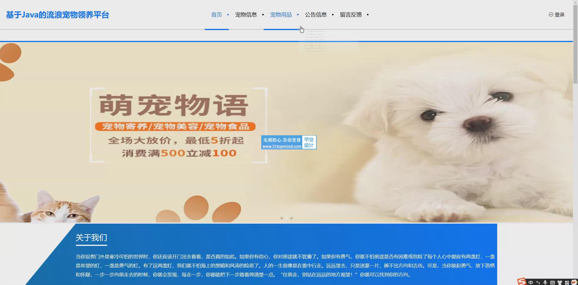 作为平台核心功能之一的是流浪宠物信息发布与管理模块,管理员可借助此模块发布宠物的基本资料、健康情形、领养需求等,方便潜在的领养者去查看,领养申请与审核模块准许用户查看可领养宠物继而提交申请,管理员审核申请内容后判定是否批准领养,保障领养过程既安全又合规。宠物健康管理模块辅助管理员把宠物健康信息记录好,保证领养者拿到全面的健康记录,本研究采用现代的Web开发技术手段,后端采用Spring Boot这个框架,前端利用Vue.js框架实现动态页面跟用户的交互,采用MySQL数据库存储数据。系统设计追随MVC架构模式,让系统结构清晰易懂,功能模块彼此间耦合程度低,利于做系统维护与扩展,研究也将留意平台的用户体验及系统性能优化,保障平台在流量上升时依旧稳定运行,并经由合理设计改善用户的使用体验感,本研究的内容不光囊括了系统设计与实现的多个范畴,还顾及到了技术挑选、系统优化以及用户体验等事项,试图为流浪宠物领养找到一个高效又便捷的解决方案。