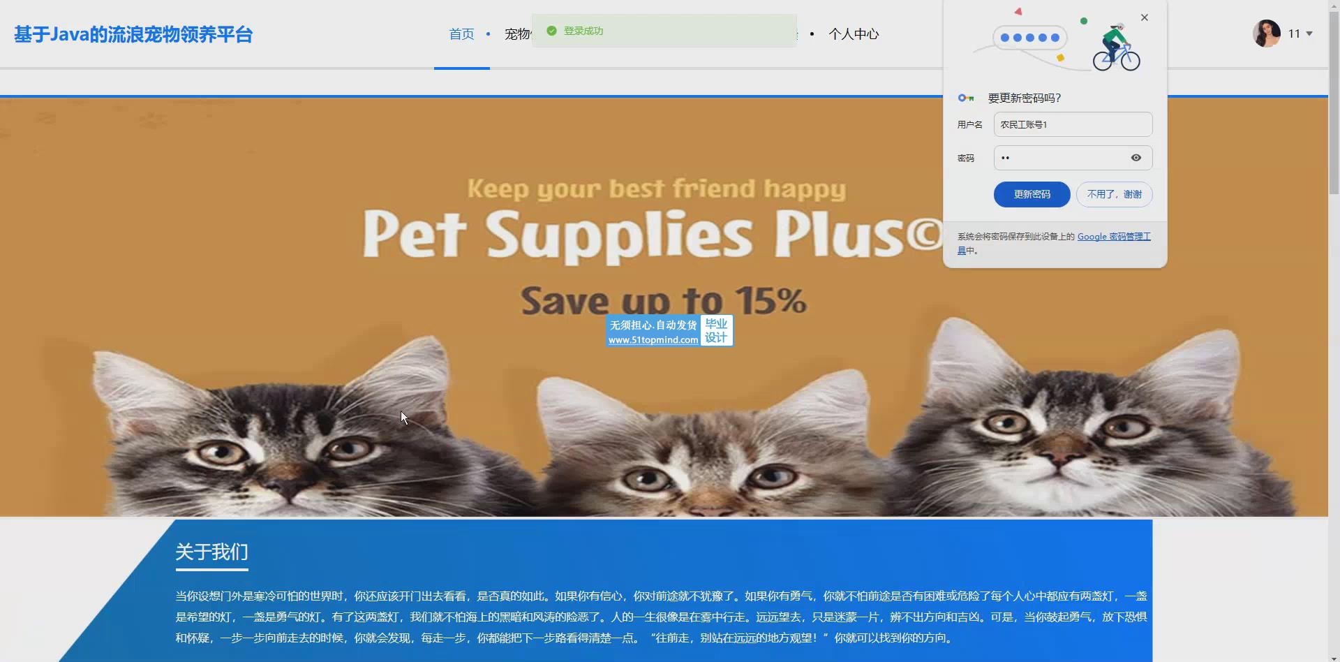 随着流浪宠物问题日益严峻,传统的宠物收养方式面临着管理混乱、信息不对称等问题。为了解决这一困境,设计并实现了一个基于Java技术的流浪宠物领养平台,旨在通过信息化手段提供便捷、高效、安全的领养服务,促进流浪宠物的收养和保护。平台的主要功能包括流浪宠物信息发布与管理、领养信息发布、领养申请与审核、宠物健康管理和用户管理等模块。管理员能够通过后台管理系统更新和管理流浪宠物的基本信息、健康状况等,并展示给潜在领养人。领养人则可以浏览宠物信息并提交领养申请,管理员审核后确保领养过程的安全与合规。该平台采用Java作为开发语言,后端基于Spring Boot框架,前端采用Vue.js,数据存储使用MySQL数据库,系统设计遵循MVC架构模式,具有良好的扩展性和维护性。通过该平台,流浪宠物的领养变得更加透明、便捷,提升了领养率,减轻了动物收容所的负担,促进了社会公益事业的发展,同时也增强了公众对流浪宠物问题的关注,具有较强的实践意义和推广价值。