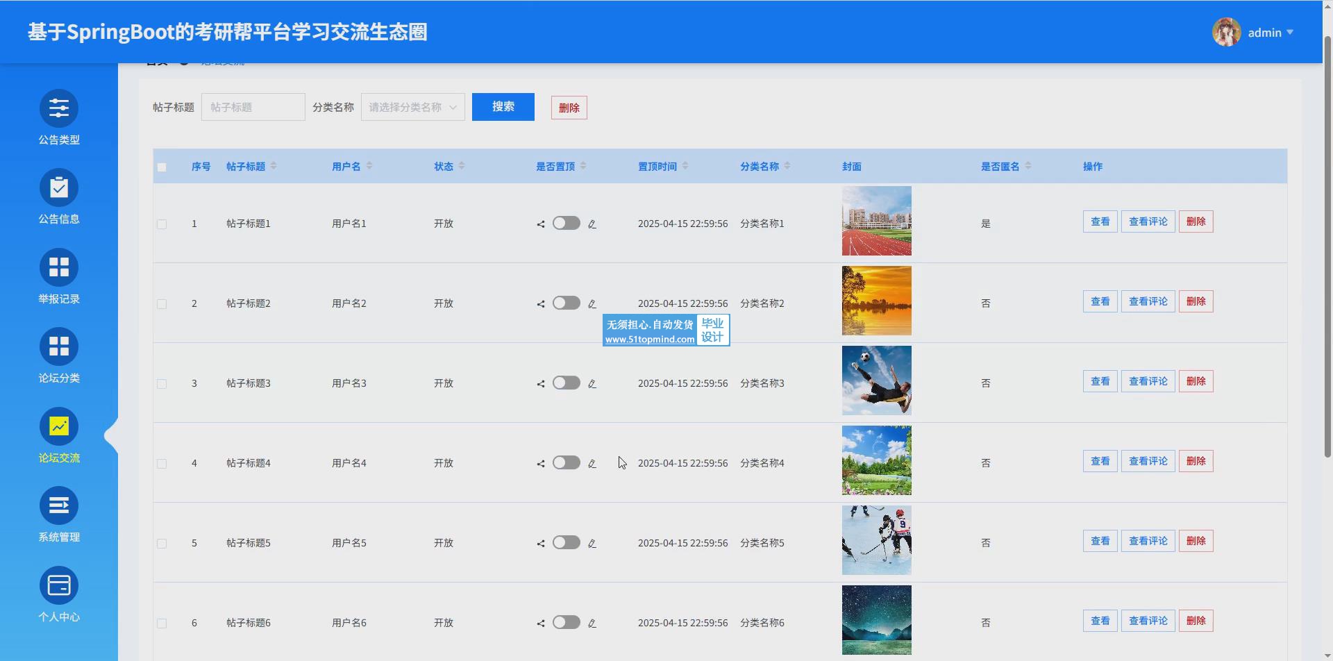 随着考研热度持续攀升,一个高效的学习交流平台成为众多考研学子的迫切需求。 “考研帮”学习交流生态圈应运而生。该平台采用当下主流且强大的技术栈构建,以 Java 语言作为核心编程语言,凭借其跨平台、高性能等特性,为平台的稳定运行奠定坚实基础。借助 Spring Boot 框架,极大地简化了开发流程,使得开发人员能够更专注于业务逻辑的实现,快速搭建起功能丰富、易于维护的后端服务架构。在数据存储方面,选择 MySQL 数据库,其卓越的性能、可靠性和强大的数据管理能力,能够高效地存储和管理平台海量的用户信息、课程资料、论坛帖子、消息记录等各类数据。通过这些技术的有机融合,“考研帮”平台为考研学生打造了一个集课程学习、资料分享、论坛交流、消息互动等多功能于一体的学习交流生态圈,助力他们在考研路上相互扶持、共同进步,向着梦想的彼岸奋勇前行。