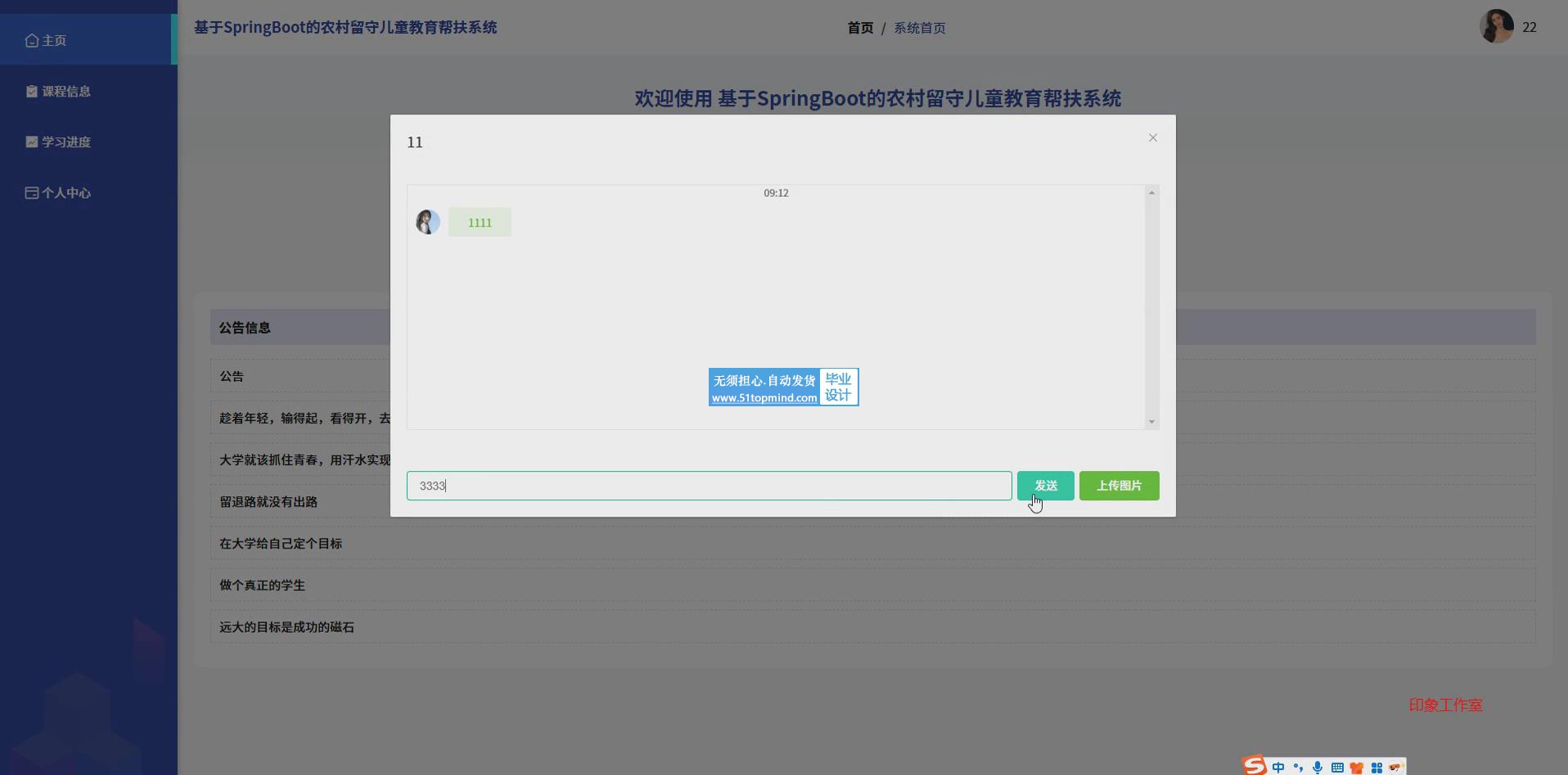 信息发送:注册用户可以向教师或志愿者发送聊天消息,咨询学习问题或寻求心理帮助。