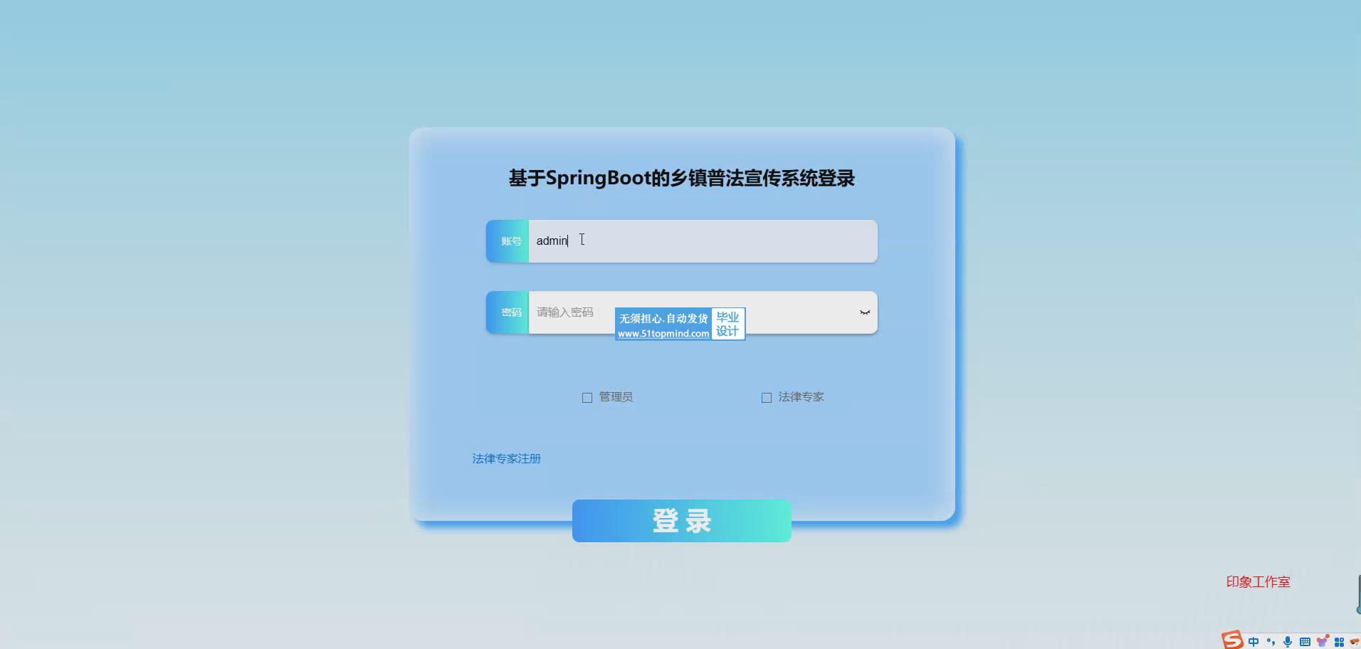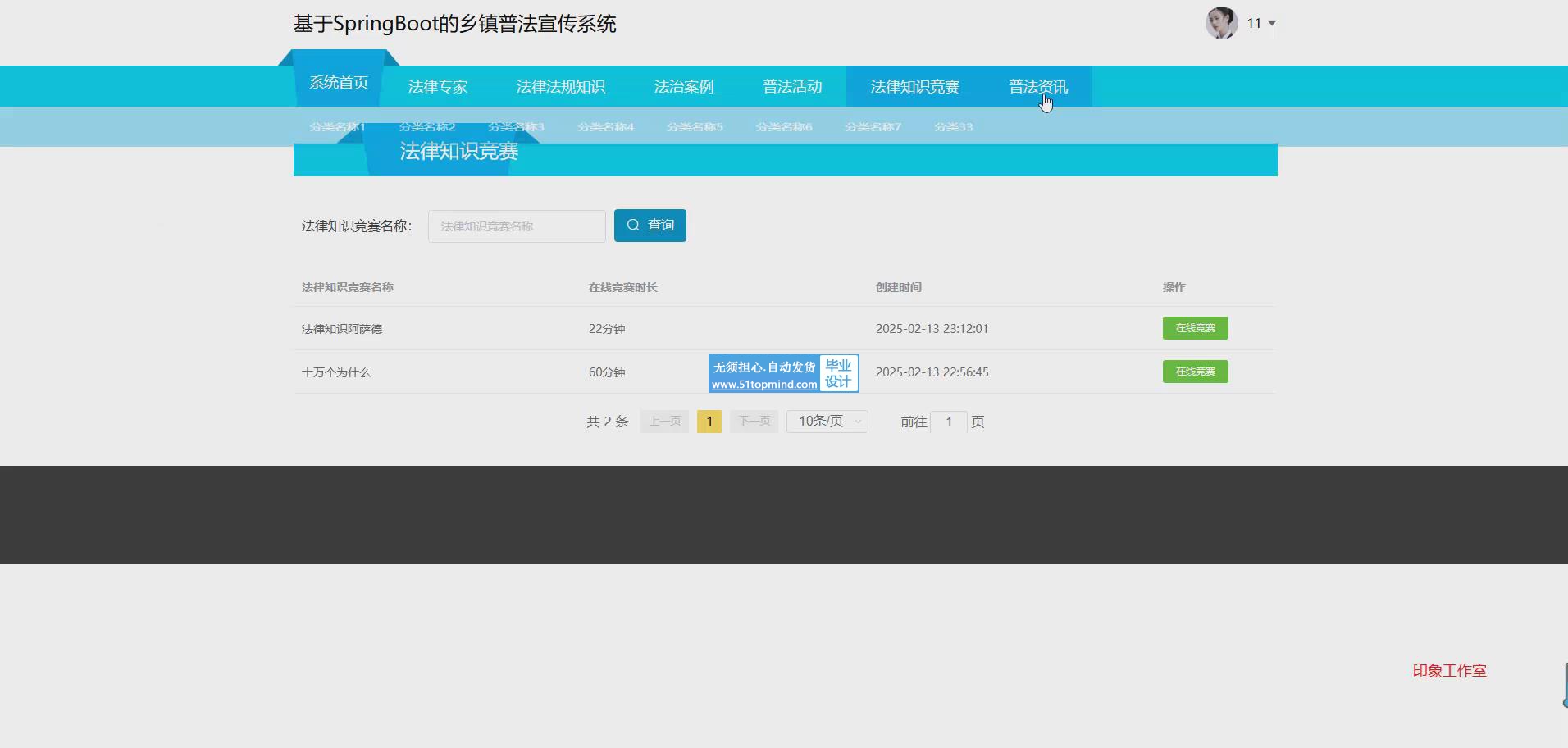 该系统基于SpringBoot、VUE以及MySQL技术构建,涵盖多类用户管理模块,实现用户注册、登录及信息管理。系统管理员可在后台管理用户数据与法律法规知识;前台为用户提供知识搜索、分类浏览与个性化推荐。法律专家能够上传法治案例,注册用户可进行在线咨询。此外,系统还设有普法活动与法律知识竞赛管理模块,实现活动创建、报名审核及考试记录生成等功能。