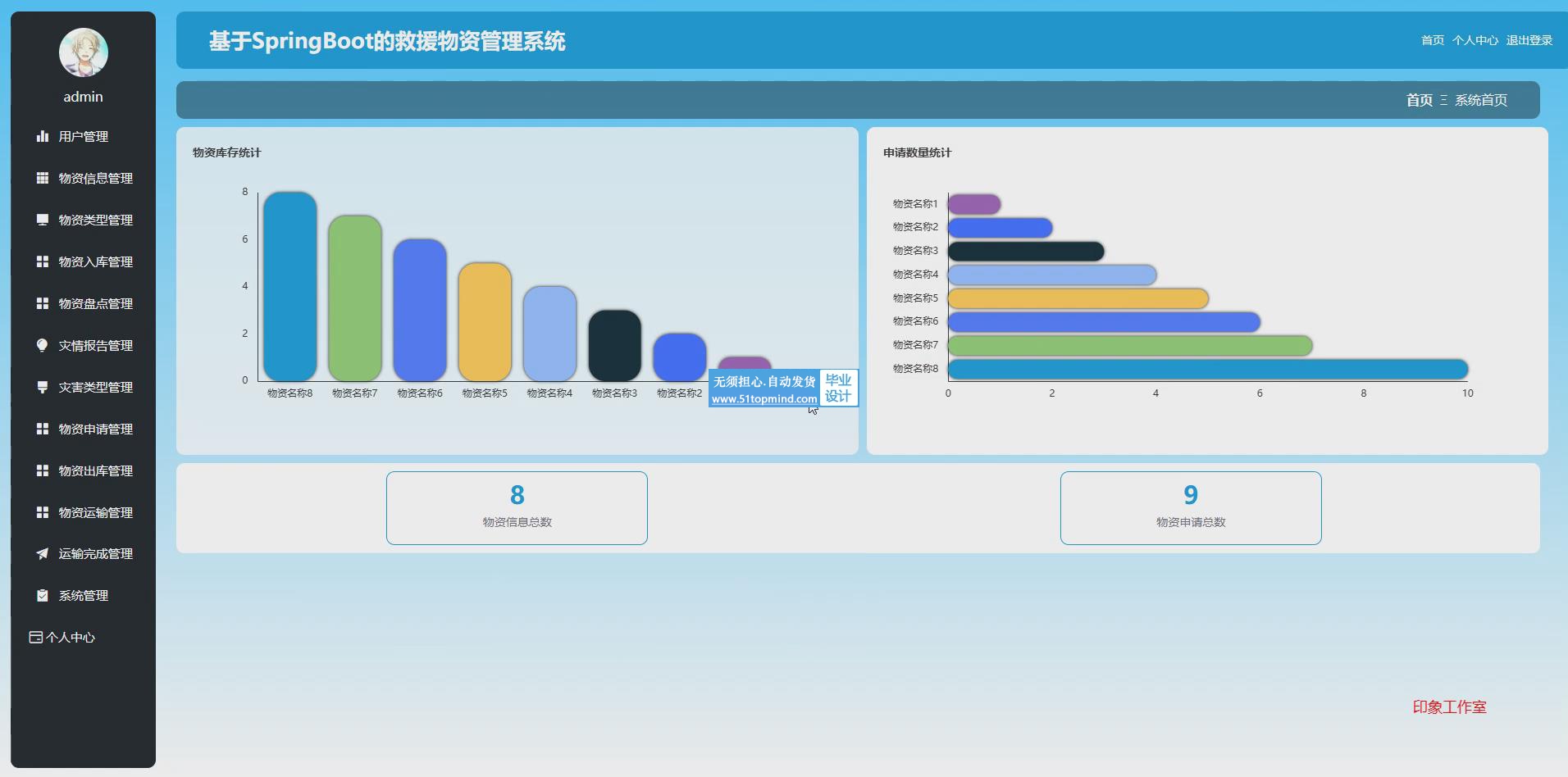 1. 系统首页:以可视化方式展示物资库存及调度情况。