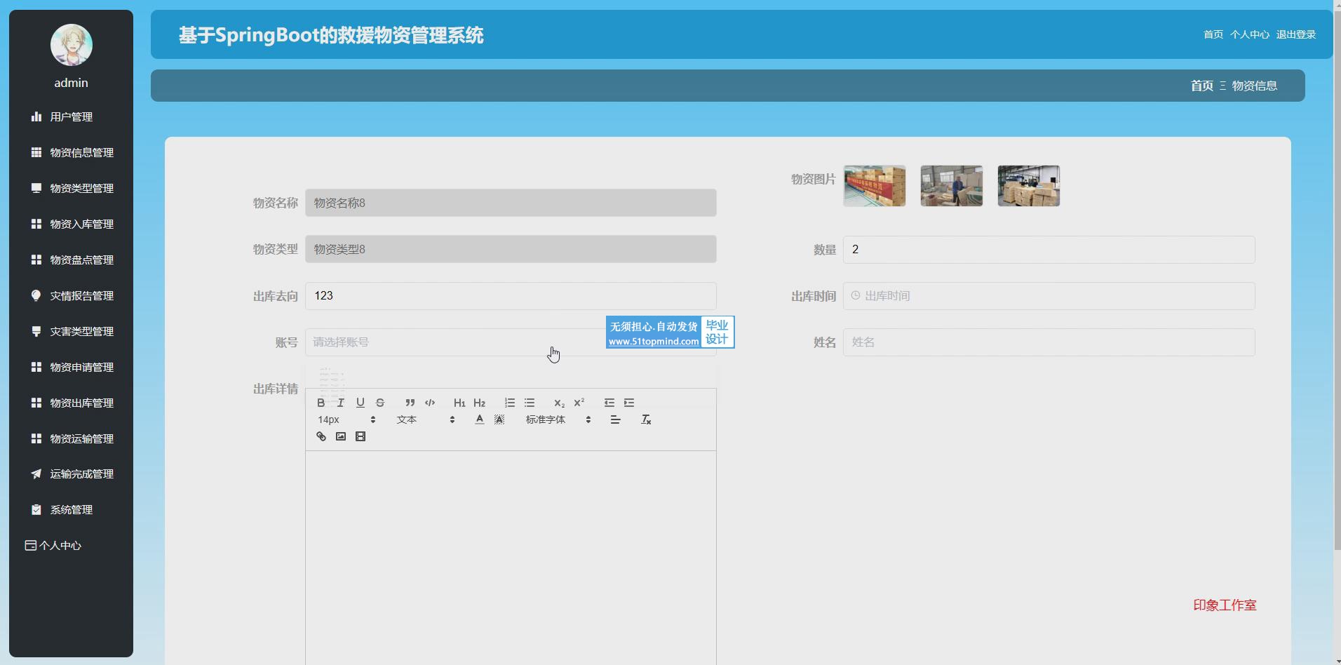 3. 物资信息管理,系统管理员创建物资信息,并管理其详细信息。