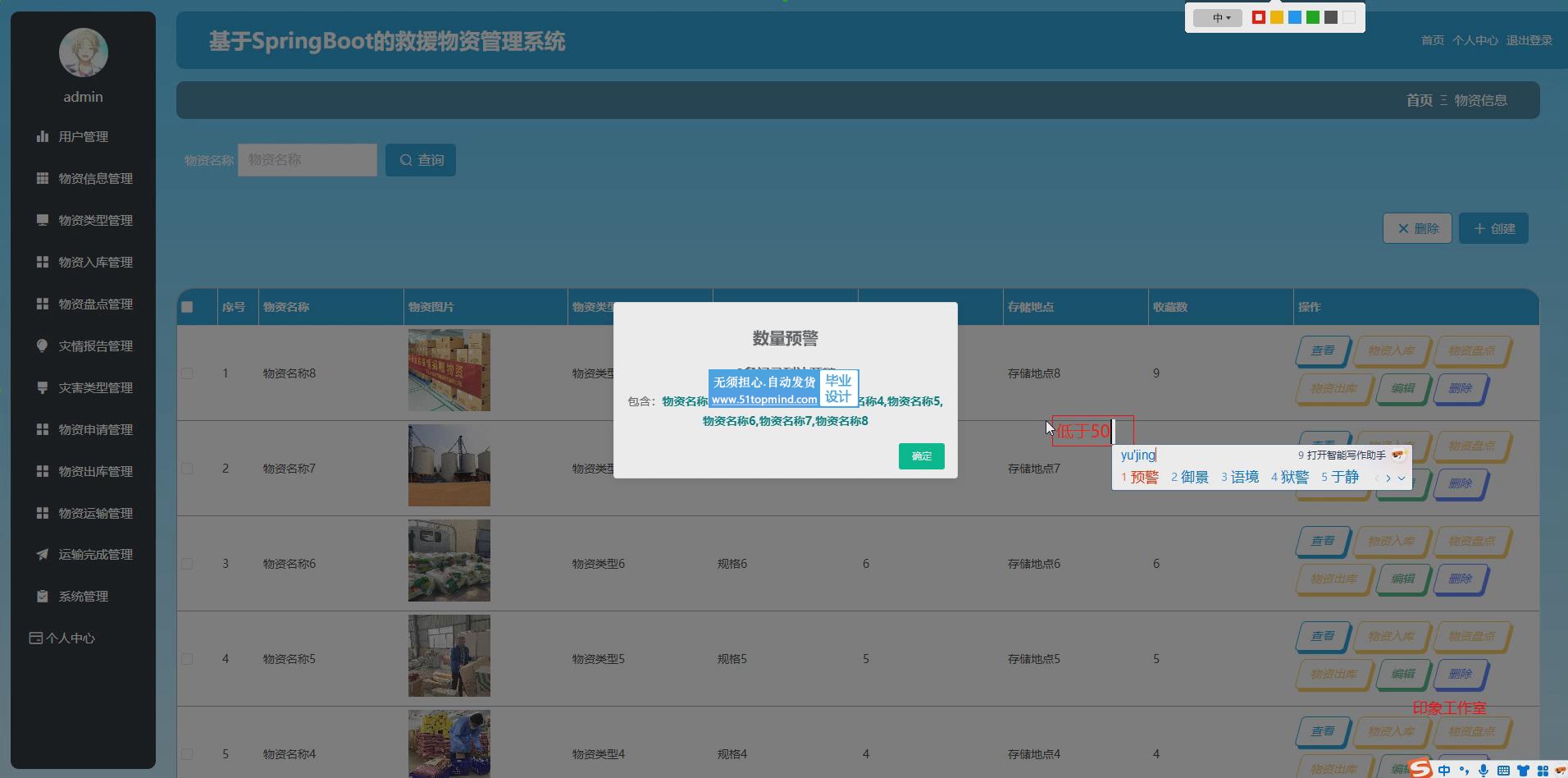 4. 物资库存管理:实时监控库存情况,提供物资进出记录,库存低于预警值时弹窗报警。