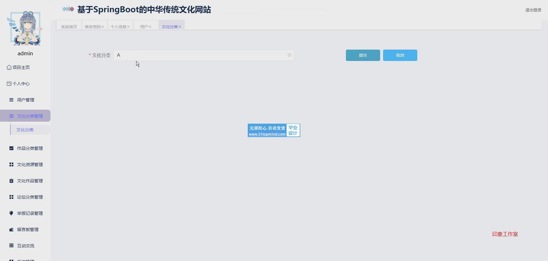 后台主要面向系统管理员,负责用户管理、文化资源管理、文化作品管理、论坛管理等功能,以维护系统的正常运行和内容的规范性。