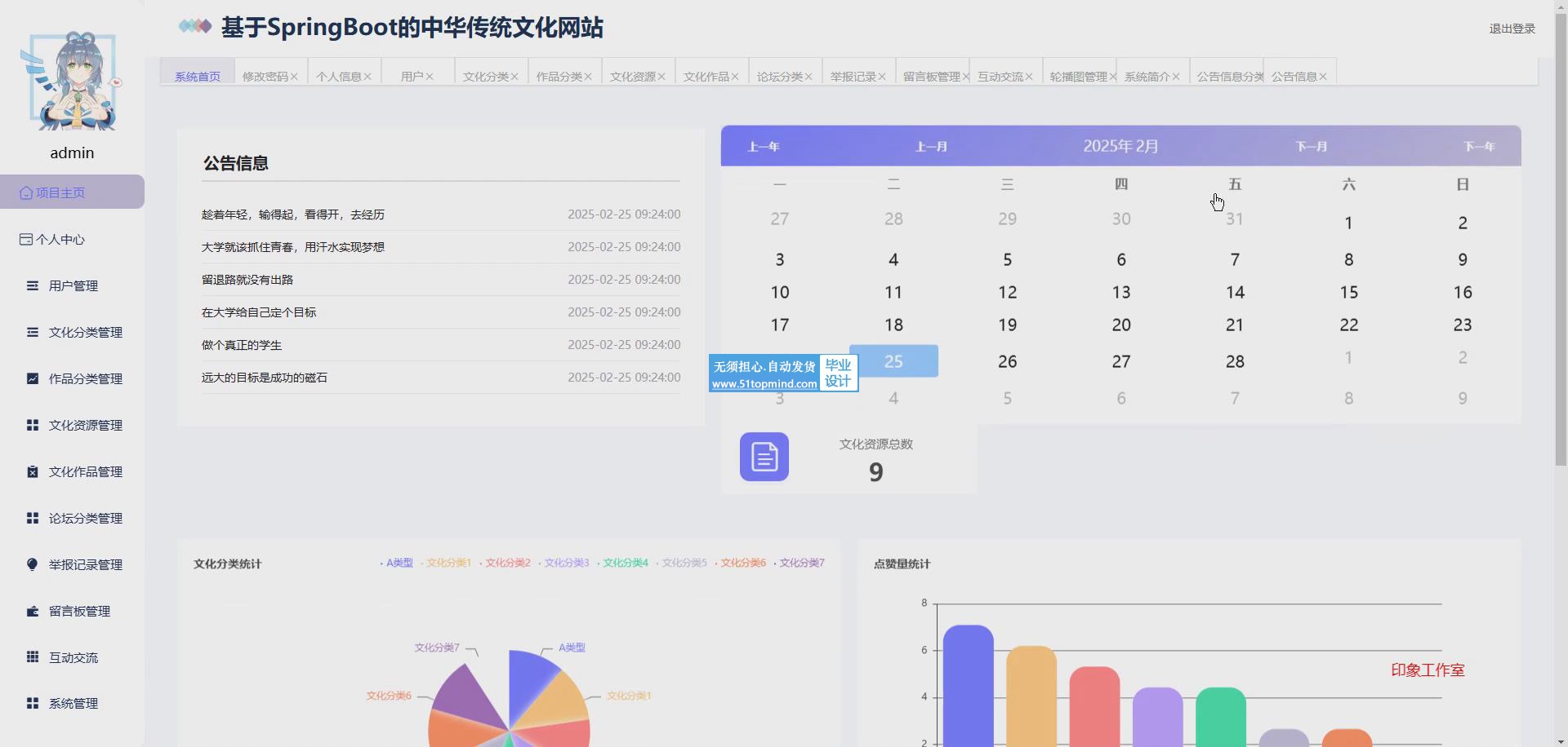 本研究主要围绕中华传统文化网站的开发与实现展开,重点研究如何通过现代Web技术构建一个集文化展示、互动交流、文化创作、智能推荐等功能于一体的平台。系统采用前后端分离架构,前端基于Vue.js框架,后端采用Spring Boot框架,并使用MySQL数据库进行数据存储。