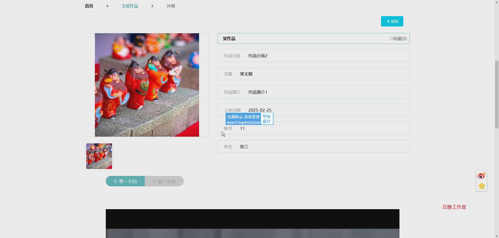 (3)查看文化作品:用户可以浏览其他用户上传的个人文化作品,并在作品详情页查看作品内容及作者信息。系统支持用户对作品进行点赞、收藏和评论,促进文化交流与互动,提升用户参与感和文化传播效果。