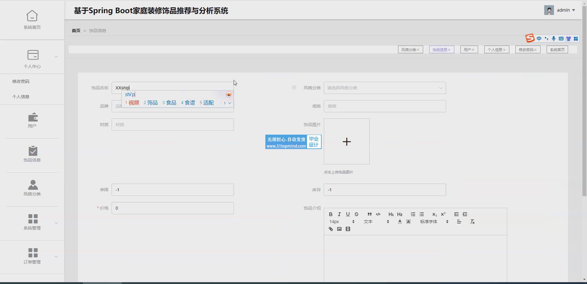 首页:展示最新、热门的装修饰品。提供搜索功能,允许用户根据关键词、风格、价格等条件筛选饰品。展示系统推荐的个性化装修饰品。