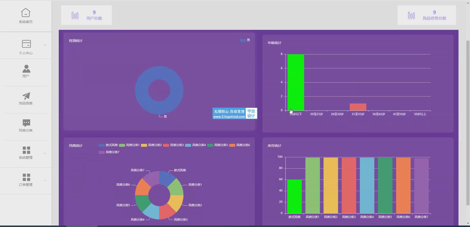 本系统明确划分为前台服务与后台管理两大板块。用户登录时,系统根据角色分配不同权限,主要分为用户与管理员人员两类。系统的主体功能围绕用户注册登录、管理人员信息处理以及饰品销售管理等环节展开。系统的功能模块包括用户注册及登录验证、管理人员对注册用户信息的保存与维护。在饰品管理方面,提供了细致的饰品分类、全面的饰品信息管理、直观的饰品图片展示、便捷的饰品搜索以及购物车添加等功能,集成了订单跟踪管理、用户交流反馈等互动性强的服务模块。