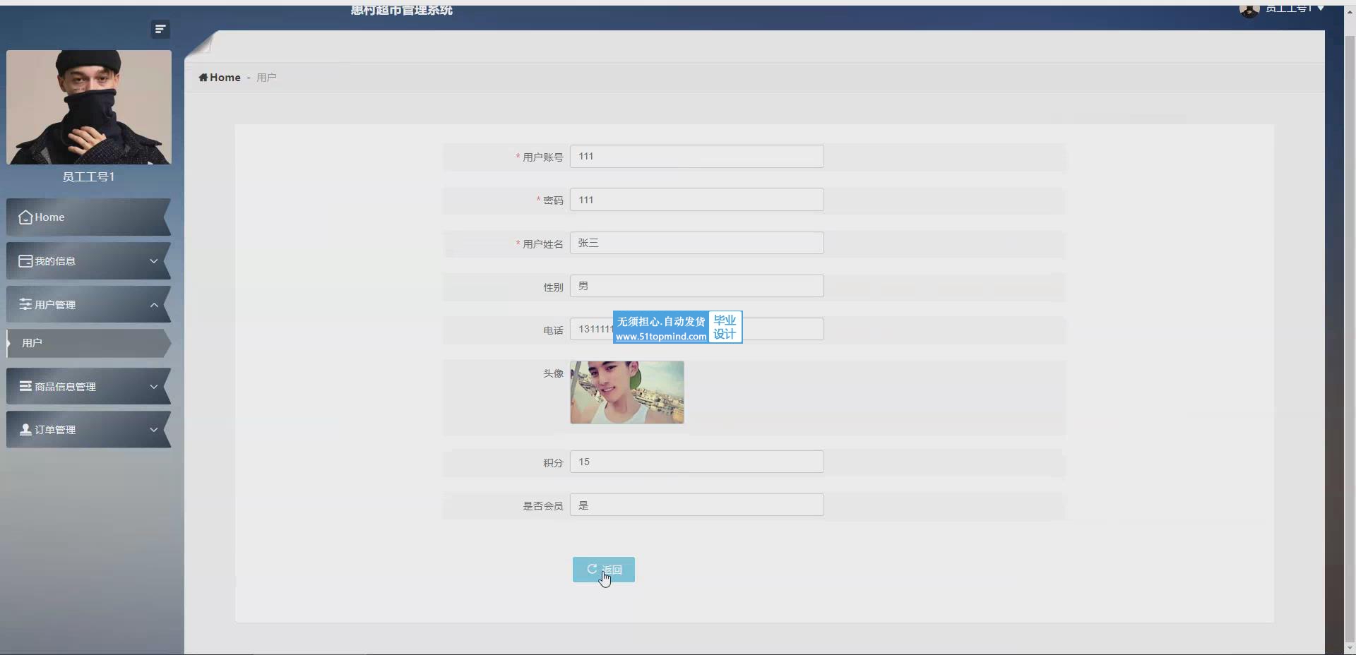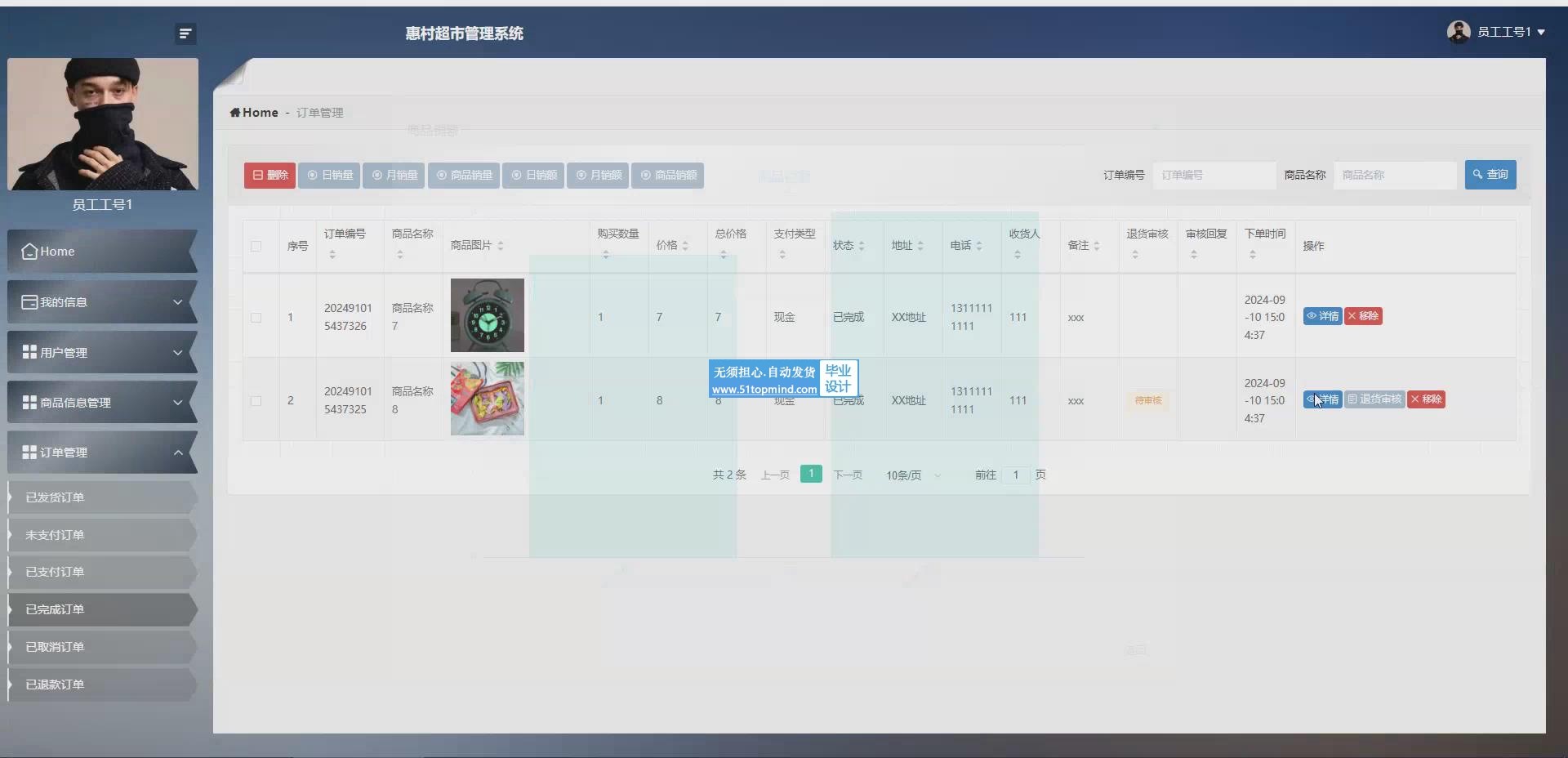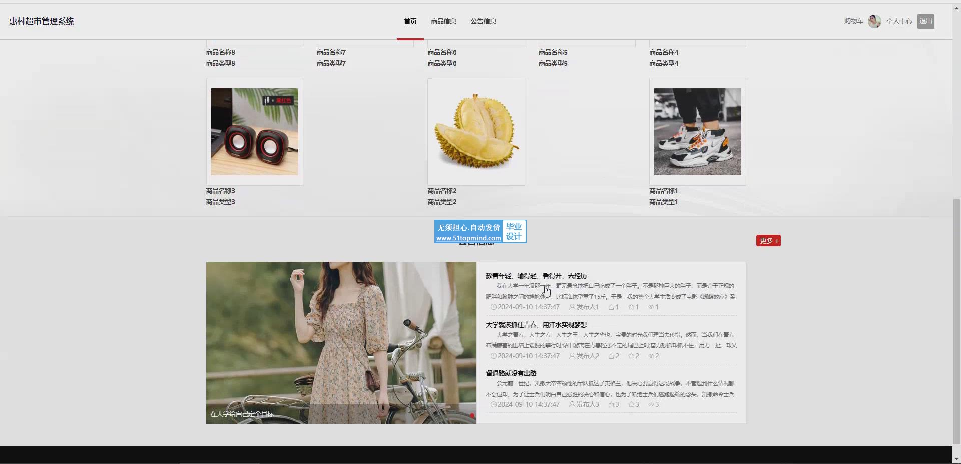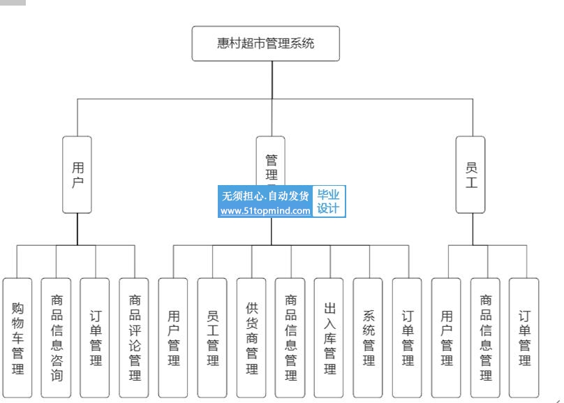 本系统为解决上述问题,开发一个超市管理系统,系统前端采用了Vue框架进行开发,后端基于SpringBoot框架构建,数据库使用MySQL进行数据存储。系统主要有前台和后台两部分。前台功能主要有商品信息、公告信息、用户中心的操作页面,用户可按需购买商品并对商品进行评价和收藏。后台功能则面向管理员和员工,提供用户管理、商品管理、库存管理、订单管理等操作,支持对销售数据的可视化分析,极大提升了超市的管理效率和客户服务水平。