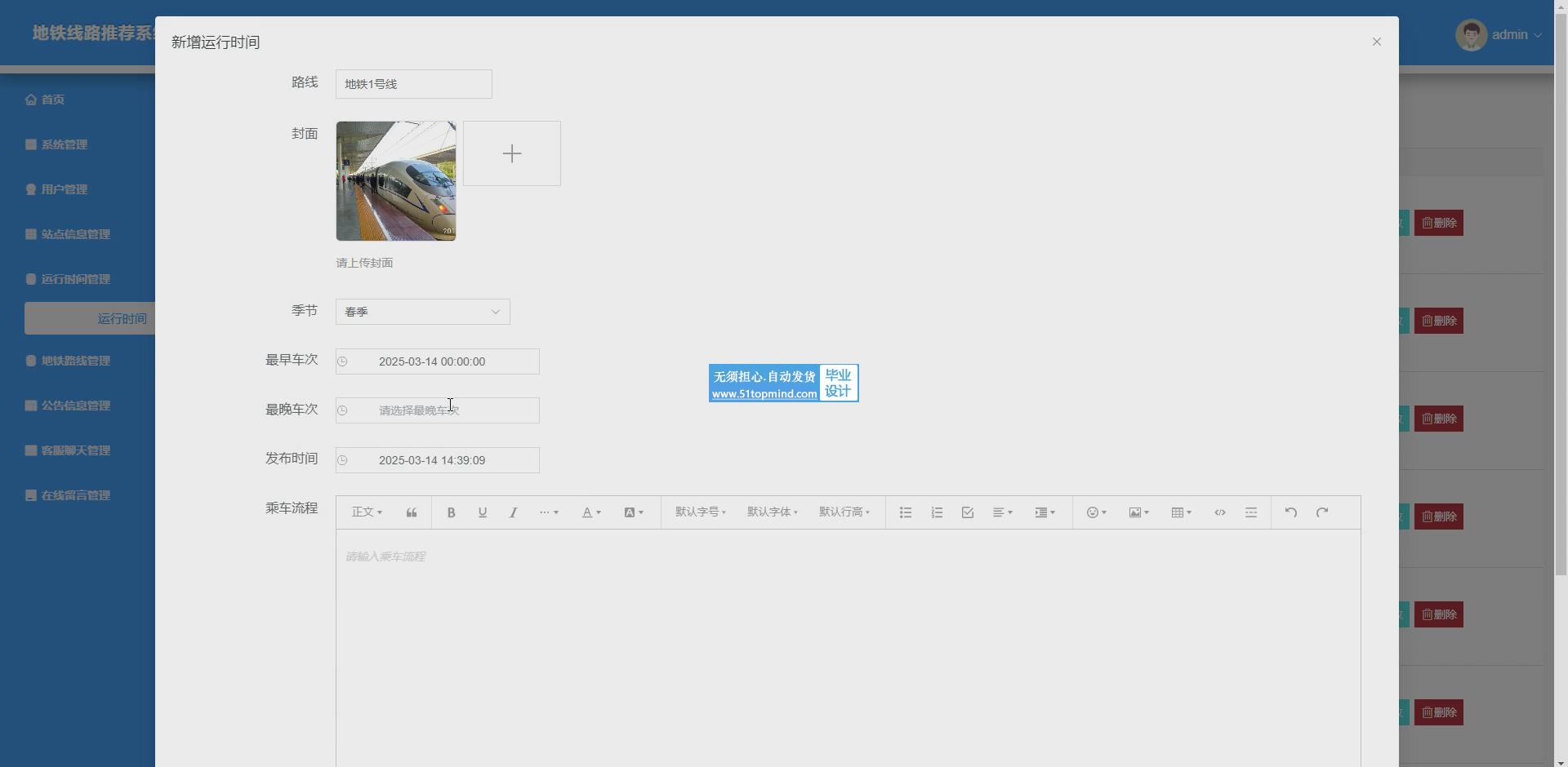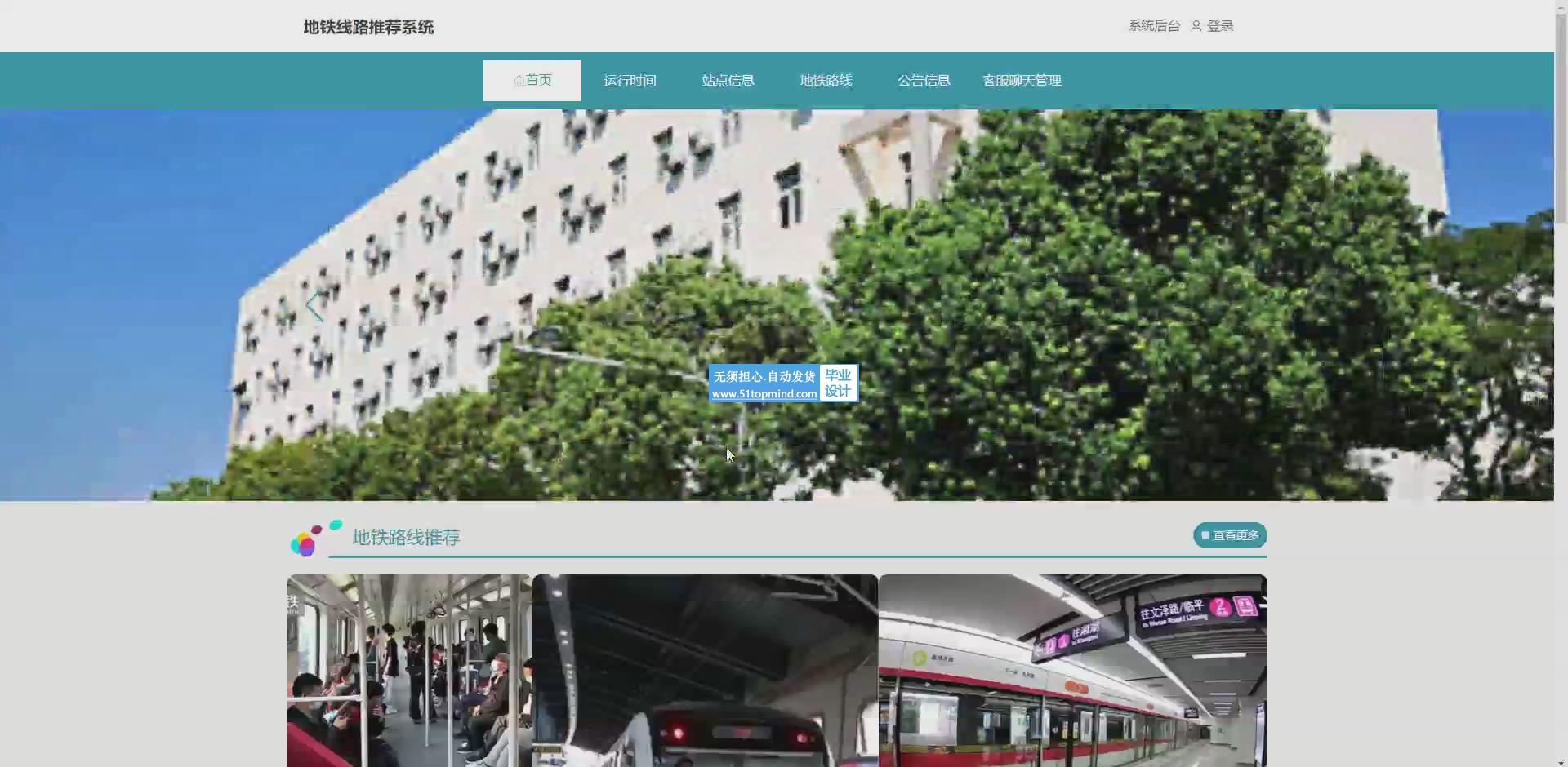 该系统为用户提供运行时间查询、站点信息查看、地铁路线获取以及客服聊天等功能,满足用户日常出行信息需求与问题咨询。同时,为管理员提供用户管理、站点信息管理、运行时间管理、地铁路线管理以及客服聊天管理等功能,便于对系统数据及用户互动进行维护与优化,确保系统高效稳定运行,提升用户体验与管理效率。随着城市化进程加快,地铁成为重要交通方式。传统地铁信息查询依赖纸质地图或人工咨询,存在信息更新滞后、查询效率低、无法个性化推荐等问题。本地铁线路推荐系统采用 Vue 构建前端,实现交互界面;后端基于 Spring Boot 框架,处理业务逻辑;数据存储使用 MySQL 数据库。系统功能涵盖用户端的运行时间查询、站点信息查看、地铁路线规划和客服聊天,以及管理员端的用户管理、站点信息管理、运行时间管理、地铁路线管理和客服聊天管理。