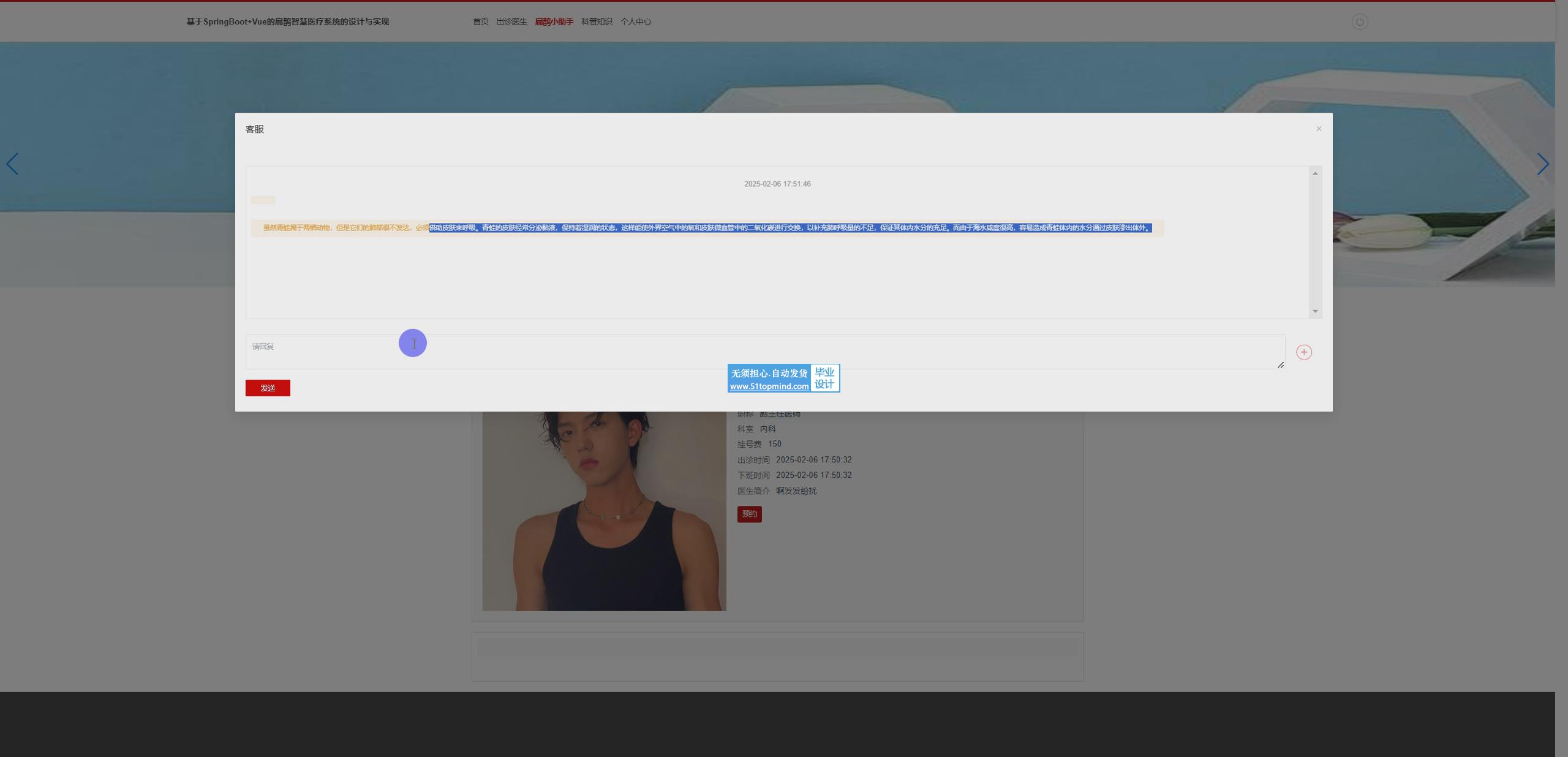 本系统基于Spring Boot框架构建后端服务,利用其强大的依赖注入与自动化配置特性,实现了高效、灵活的系统架构。前端采用Vue框架,通过组件化开发模式,提升了用户界面的交互体验与响应速度。数据库方面,采用MySQL存储系统数据,确保了数据的安全性与可扩展性。系统采用B/S架构,实现了跨平台访问,便于用户随时随地获取医疗服务。主要功能包括用户管理、在线预约挂号、电子病历管理、健康数据分析与报告生成、医生在线咨询等。通过整合Java后端开发、Spring Boot框架的便捷性、Vue前端的高效渲染以及MySQL数据库的稳定存储,系统实现了患者信息管理、医生排班与诊疗记录追踪等核心功能,为患者提供了个性化的健康管理服务,为医生提供了全面的患者数据视图。