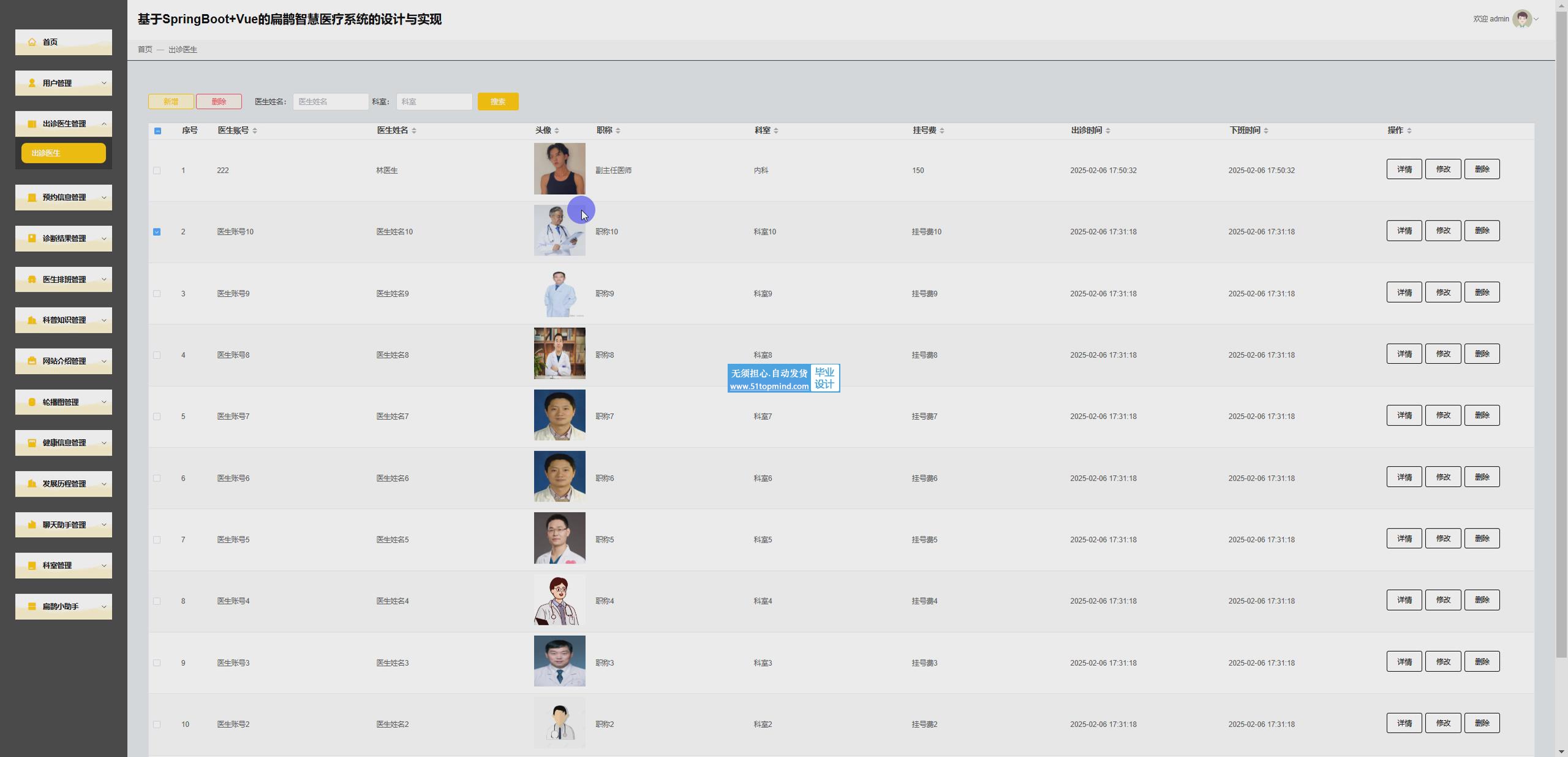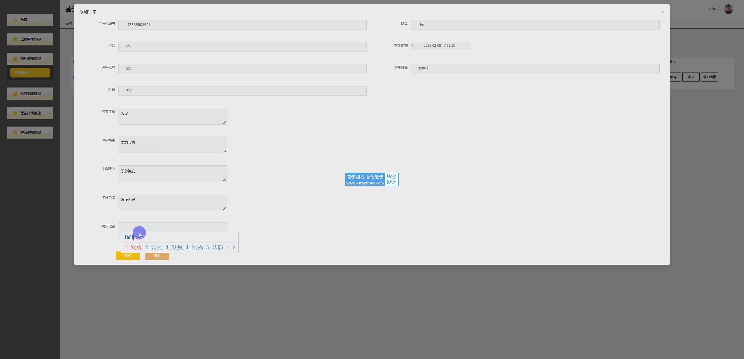 智慧医疗系统基于Spring Boot与Vue技术栈精心打造,其系统结构清晰且高效。前端界面由Vue.js框架构建,提供直观易用的用户界面,支持患者与医生的实时互动、在线预约、健康数据可视化等功能。后端则依托Spring Boot框架,实现业务逻辑处理、数据交互及接口提供。通过RESTful API,前端与后端实现无缝对接,确保数据的安全传输与高效处理。数据库层采用MySQL数据库,设计涵盖用户、患者、科室、医生、排班、预约记录及诊疗记录等核心表结构,为系统提供坚实的数据支撑。系统还融入智能算法,对健康数据进行深度挖掘与分析,为患者提供个性化的健康建议。整体而言,智慧医疗系统结构严谨,前端与后端紧密协作,数据库层提供有力支持,共同打造出一个智能化、高效化的医疗服务平台,为患者与医生带来便捷、舒适的医疗体验。在当今社会,医疗资源分配不均与医疗服务需求日益增长之间的矛盾日益凸显,构建高效、便捷的智慧医疗系统成为提升医疗服务质量的关键。本课题旨在设计并实现一款名为“康健智慧医疗平台”的系统,旨在通过信息化手段优化医疗资源配置,为患者提供便捷的线上医疗服务,同时为医生提供高效的工作平台,促进医患之间的有效沟通,提升医疗服务的整体效率与质量。