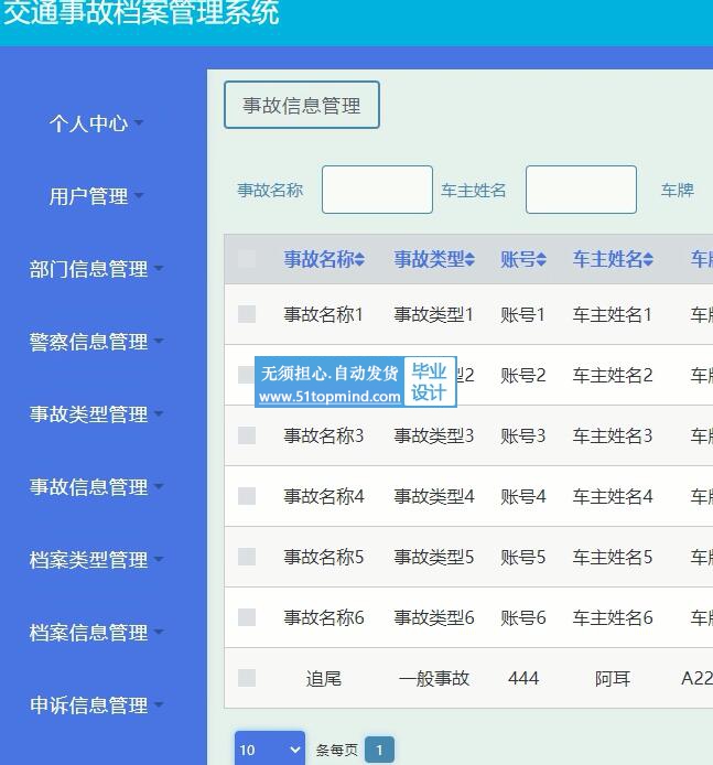 管理员;个人中心、用户管理、部门信息管理、警察信息管理、事故类型管理、事故信息管理、档案类型管理、档案信息管理、申诉信息管理,