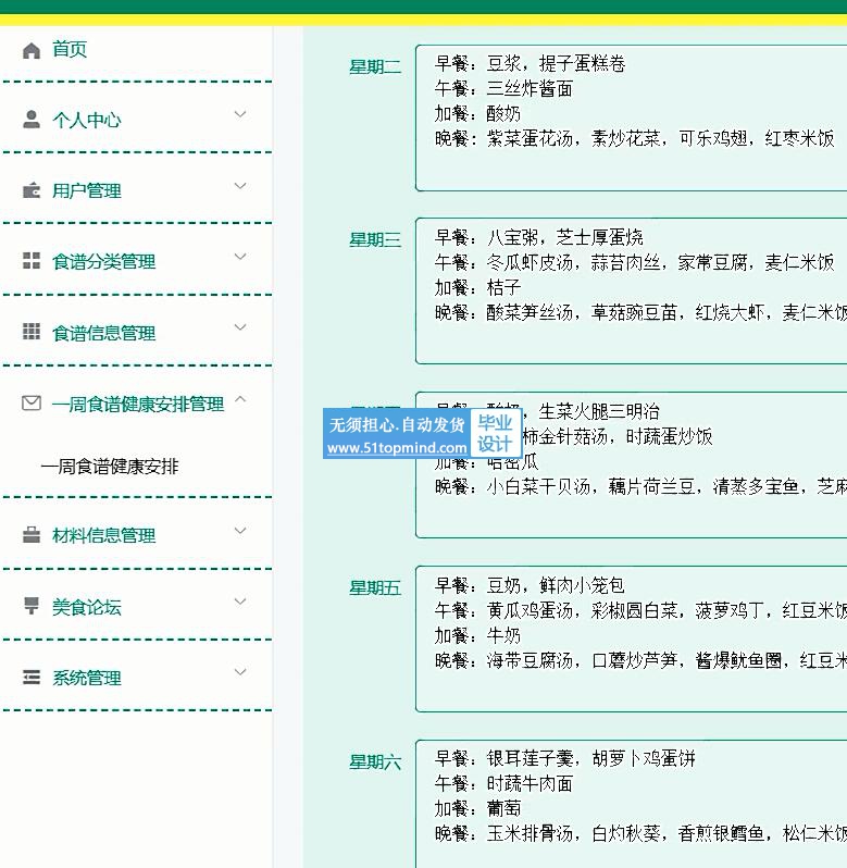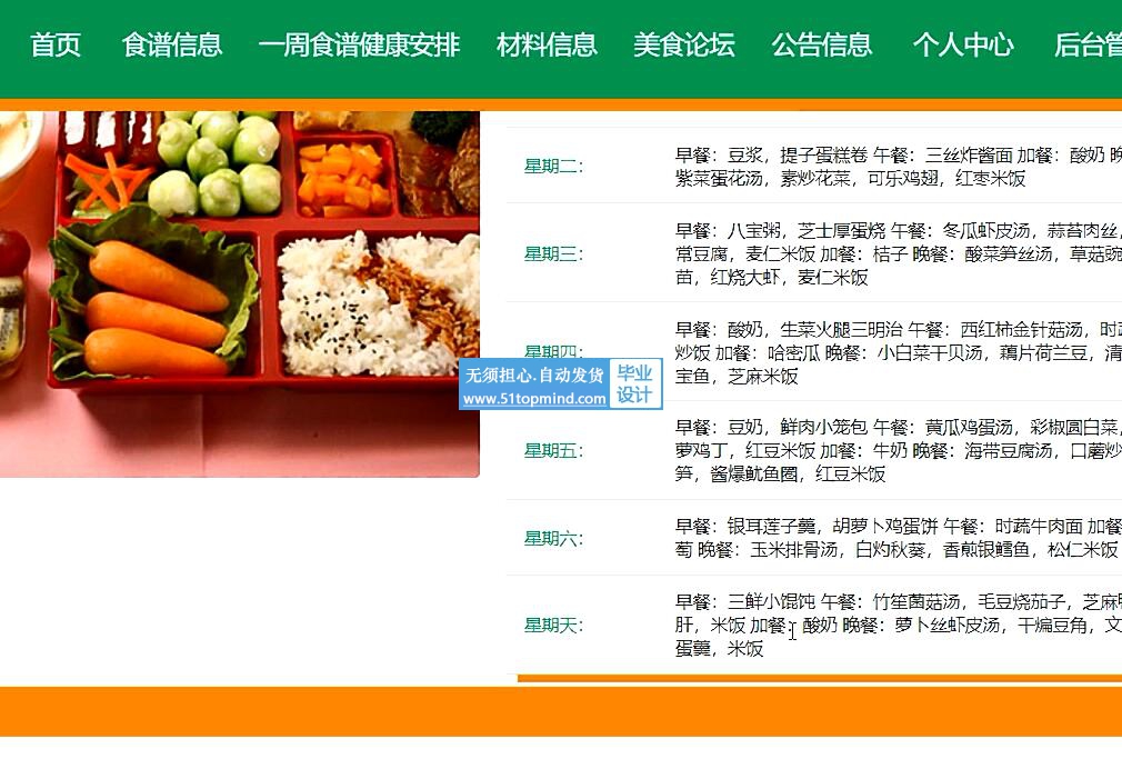 家庭食谱管理系统的主要使用者分为管理员和用户,实现功能包括管理员:首页、个人中心、用户管理、食谱分类管理、食谱信息管理、一周食谱健康安排管理、材料信息管理、美食论坛、系统管理,用户:首页、个人中心、我的收藏管理、美食论坛,前台首页;首页、食谱信息、一周食谱健康安排、材料信息、美食论坛、公告信息、个人中心、后台管理等功能。由于本网站的功能模块设计比较全面,所以使得整个家庭食谱管理系统的信息管理过程得以实现。