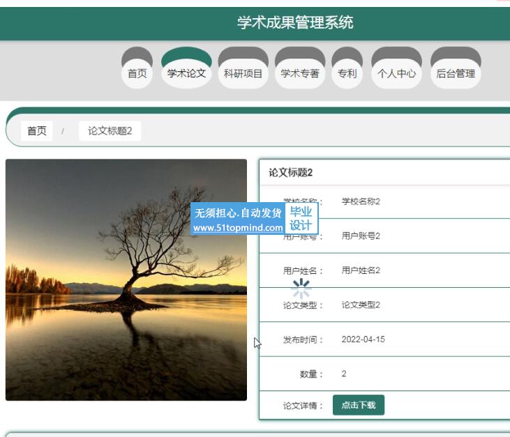 主要对主页、个人中心、用户管理、学术论文管理、科研项目管理、学术专著管理、专利管理、系统管理的实现。