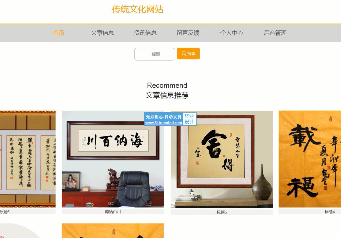 本站是一个B/S模式系统,采用Java的SSM框架作为开发技术,MYSQL数据库设计开发,充分保证系统的稳定性。系统具有界面清晰、操作简单,功能齐全的特点,使得传统文化网站管理工作系统化、规范化。