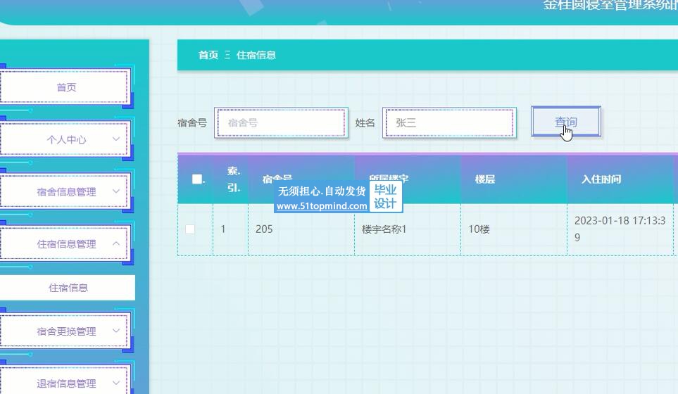 宿管主要功能为:个人中心、宿舍信息管理、住宿信息管理、宿舍更换管理、退宿信息管理等功能。