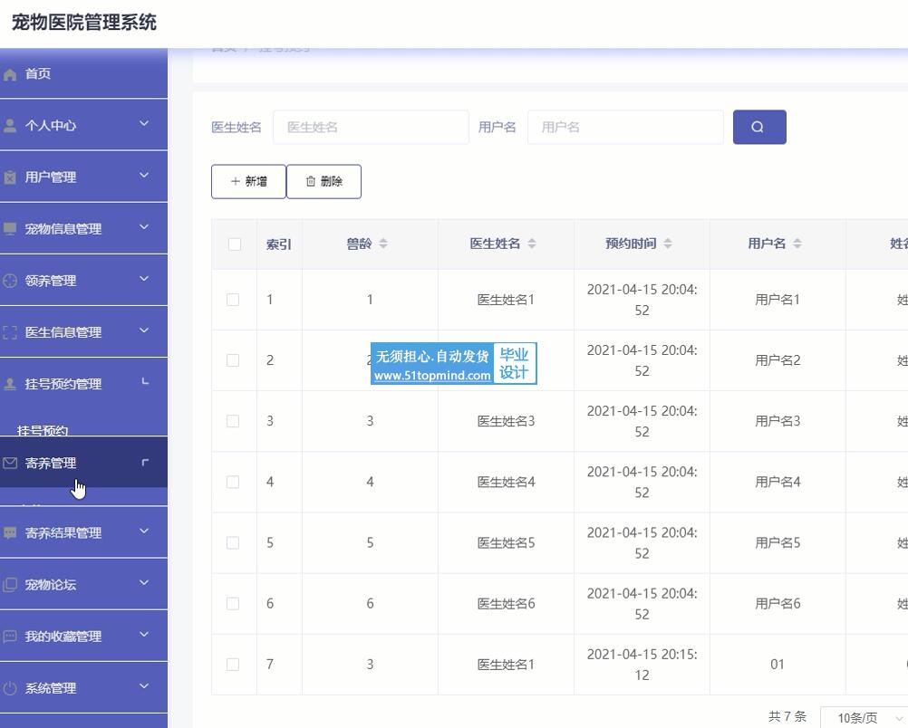 (5)领养、寄养信息查看:查看可被领养的宠物的信息以及查看被寄养的宠物信