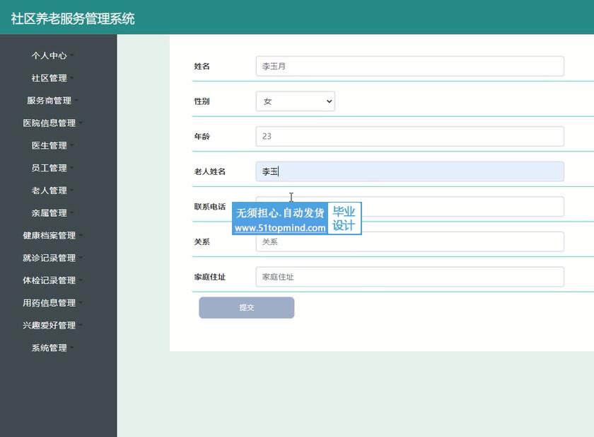 管理员登录后可进行个人中心、社区管理、服务商管理、医院信息管理、医生管理、员工管理、老人管理、亲属管理、健康档案管理、就诊记录管理、体检记录管理、用药信息管理、兴趣爱好管理、系统管理