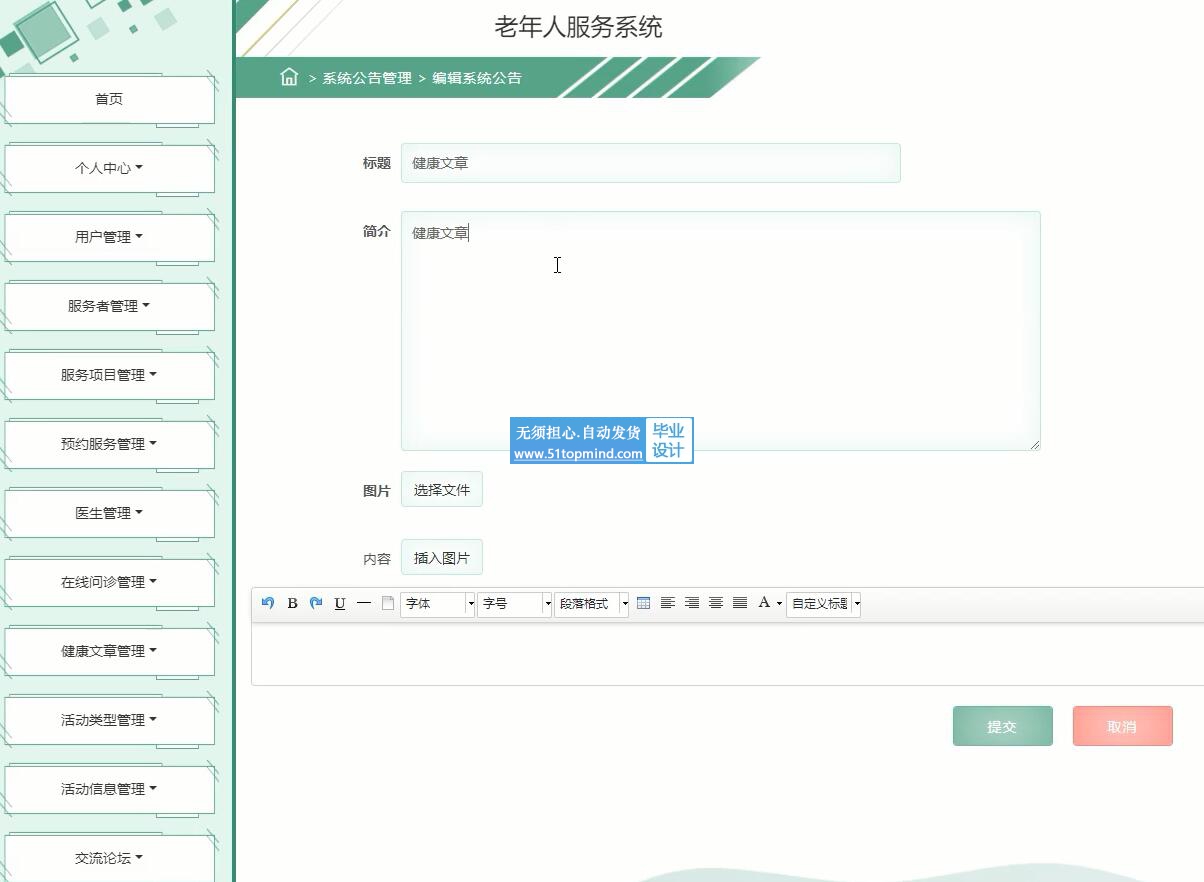 (6)健康管理:对健康养生文章的推送和对医生的各项资料信息进行增删改查处理。