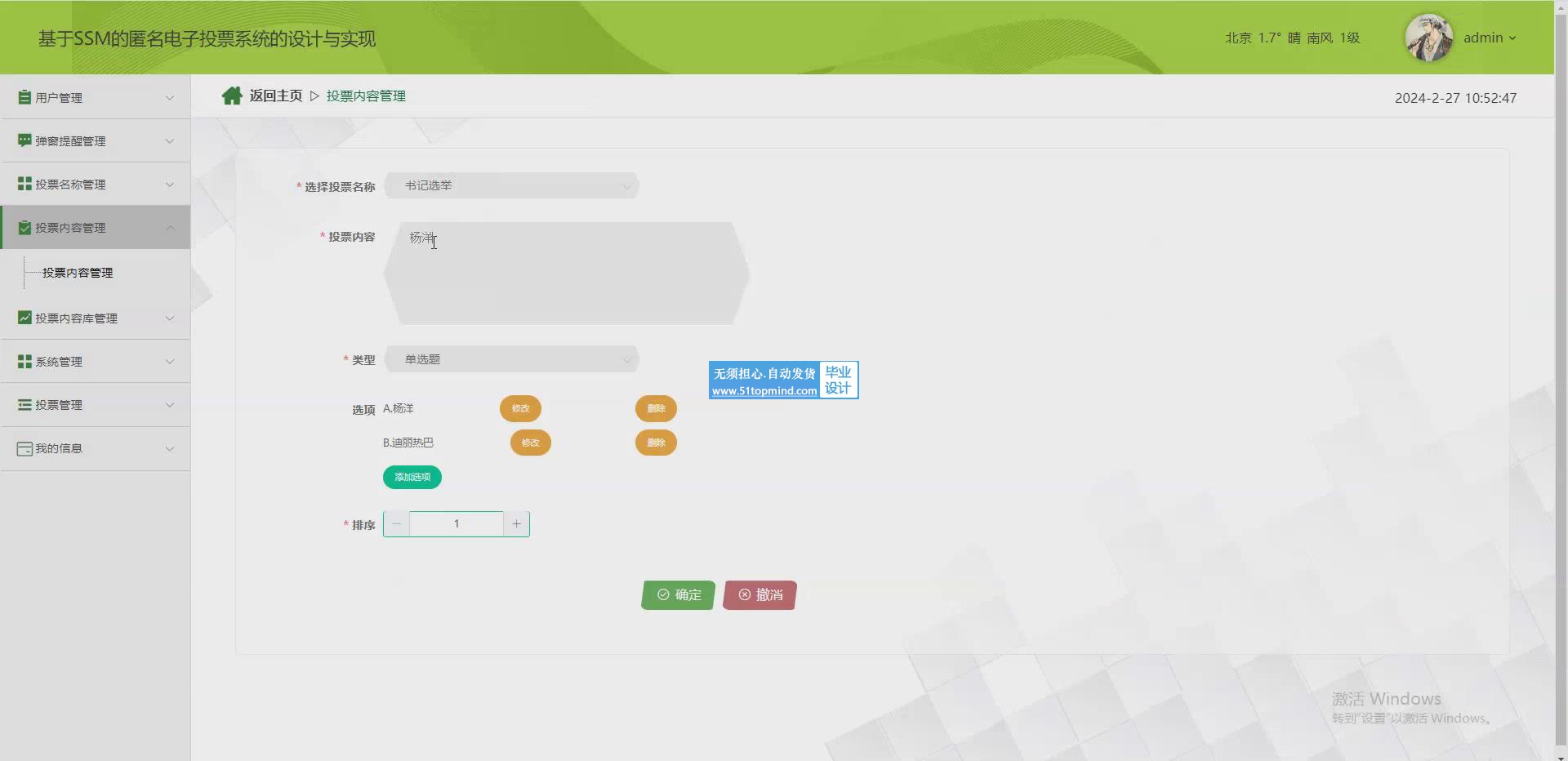 匿名电子投票系统的设计内容通常包含前端开发、后端开发和数据库设计,使用Vue.js作为前端框架,SSM作为后端框架,MySQL作为数据库管理系统。后端开发部分中Spring负责管理对象的生命周期,提供依赖注入和事务管理等功能。SpringMVC负责处理前端请求,将请求转发到相应的处理方法,并返回结果给前端。MyBatis则负责数据库操作,通过映射文件实现SQL与Java对象之间的映射关系。匿名电子投票系统的功能模块包括用户管理、投票项目管理、投票内容管理、弹窗提醒管理、通知管理等功能,为用户提供了一个便捷、高效的匿名电子投票平台。