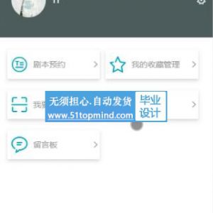 前端小程序主要功能有,用户注册登陆,个人信息管理,查看店铺,查看剧本,线上预约活动,在线留言交流。