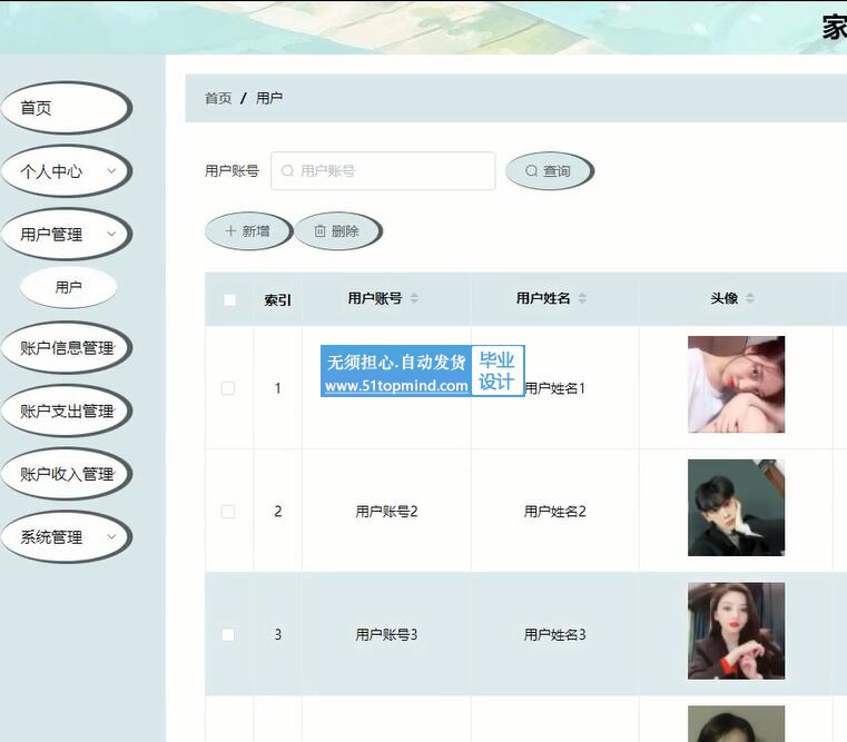 本系统的用户可分为用户模块和管理员模块两个界面组成。一个界面用于管理员登录,管理员可以管理系统内所有功能,主要有首页、个人中心、用户管理、账户信息管理、账户支出管理、账户收入管理、系统管理等功能;另外一个界面用于用户登录,用户登录系统可以实现首页、我的等功能。