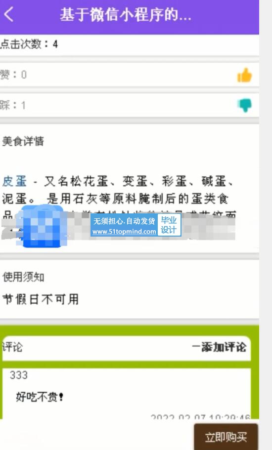 本文从管理员、用户的功能要求出发,微信小程序的美食推荐系统中的功能模块主要是实现首页、个人中心、用户管理、美食分类管理、美食推荐管理、特色美食管理、订单信息管理、系统管理。经过认真细致的研究,精心准备和规划,最后测试成功,系统可以正常使用。分析功能调整与微信小程序的美食推荐系统实现的实际需求相结合,讨论了express开发微信小程序的美食推荐系统的使用。With the development of society and the progress of science and technology, Internet technology is becoming more and more popular. Mobile phones are also gradually loved by the broad masses of the people, and have gradually entered the use of each user. Mobile phones have the advantages of convenience, high speed, high efficiency and low cost. Therefore, it is very meaningful to build an operating system that meets our own requirements.