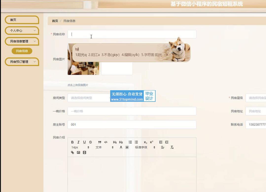 随着我国经济的繁荣发展和地区之间的便利交通,人们在外出时对于酒店的需求越来越高。民宿作为当下比较流行的出行住宿方式,深受房屋短租用户的欢迎,其租赁价格适中、住宿体验具有家庭感等优势,已经使其成为继星级酒店、快捷酒店、农家院之后的又一住宿类别。而民宿作为新兴住宿方式,其分布范围广、房东多为个体等问题使其迎合互联网经济的难度较大,就需要以互联网思维并应用软件技术加以信息化改造。目前现有系统存在的问题是:借助于浏览器的系统加载缓慢,大大降低了效率。而建立在 APP 平台上需要下载软件,非常的不便,而且开发周期长,需要适应不同操作系统。微信如今被大众广泛的应用,具有灵活性强、便捷性高的特点,同时微信支持众多小程序的开发,为开发者们提供了一个良好的开发空间。因为这些优点,所以应用范围越来越广泛,成为各行各业开发平台的首选。本课题主要基于微信小程序的民宿短租系统的设计,实现了在微信小程序里的民宿房屋的管理系统,系统将房屋信息发布,房屋租赁等功能集于一身,为热爱旅游的用户提供了多种多样的房屋租赁业务,同时也方便了房屋的拥有者发布信息,使资源的使用最大化。实现的主要模块:用户登录注册模块,查询模块,订单管理模块,用户浏览模块,用户预约模块以及发布租赁信息模块。