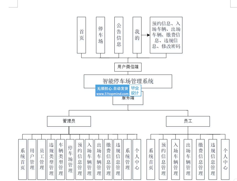 智能停车场管理系统主要分为三种用户操作:用户微信端:可以浏览页面发布的停车场、公告信息,也可注册成为用户;管理员、员工服务端:管理员服务端的登录、修改密码等功能;管理员可以对预约信息、入场车辆、出场车辆、缴费信息、违规信息等进行管理[8]。