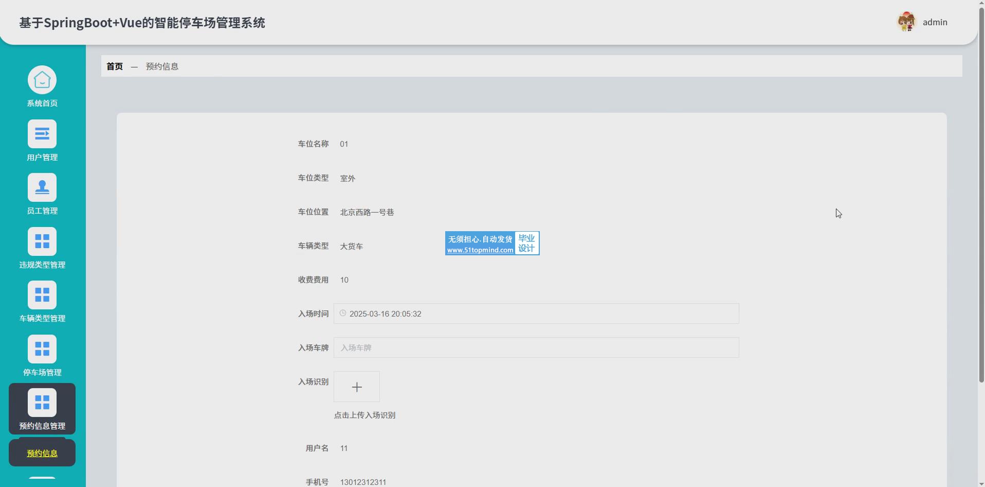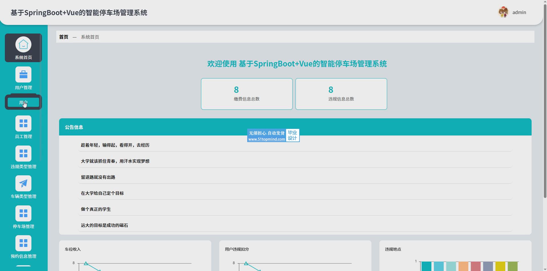 智能停车场管理系统的开发,使游客可以在页面浏览停车场、公告等各种信息,也可以注册成为平台用户[9]。用户具备信息搜索、预约的功能,可以搜索缴费信息、违规信息等信息,通过管理员的服务端审核之后,就可以展示在页面上。而管理员服务端则可以对所有的注册用户进行增、删、改、查、修改密码等基础操作。同时对于注册用户,预约信息、入场车辆、出场车辆等可以进行修改、删除等操作[10]。