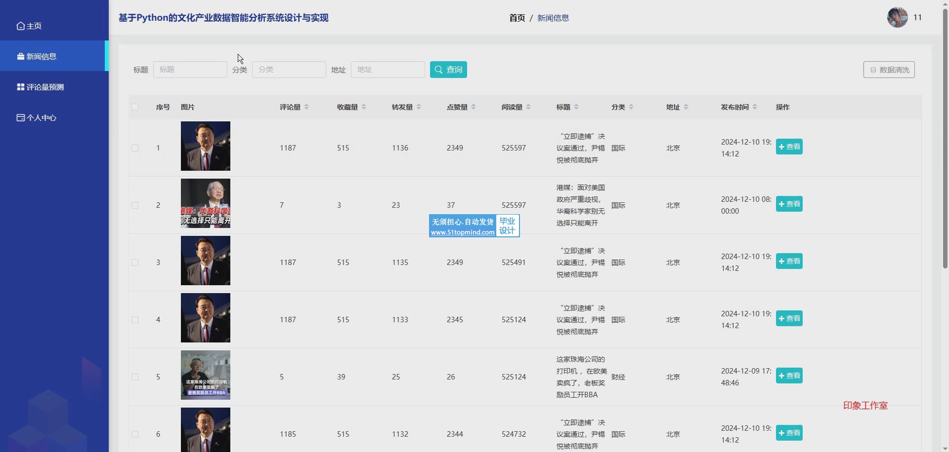 用户可以通过系统查看新闻信息,包括新闻标题、分类、发布时间、阅读量、评论量等;进行个性化新闻推荐,系统根据用户浏览历史和兴趣偏好推荐相关新闻;查看评论量预测结果,了解新闻的潜在热度;在个人中心管理个人信息,包括修改密码、更新个人资料等