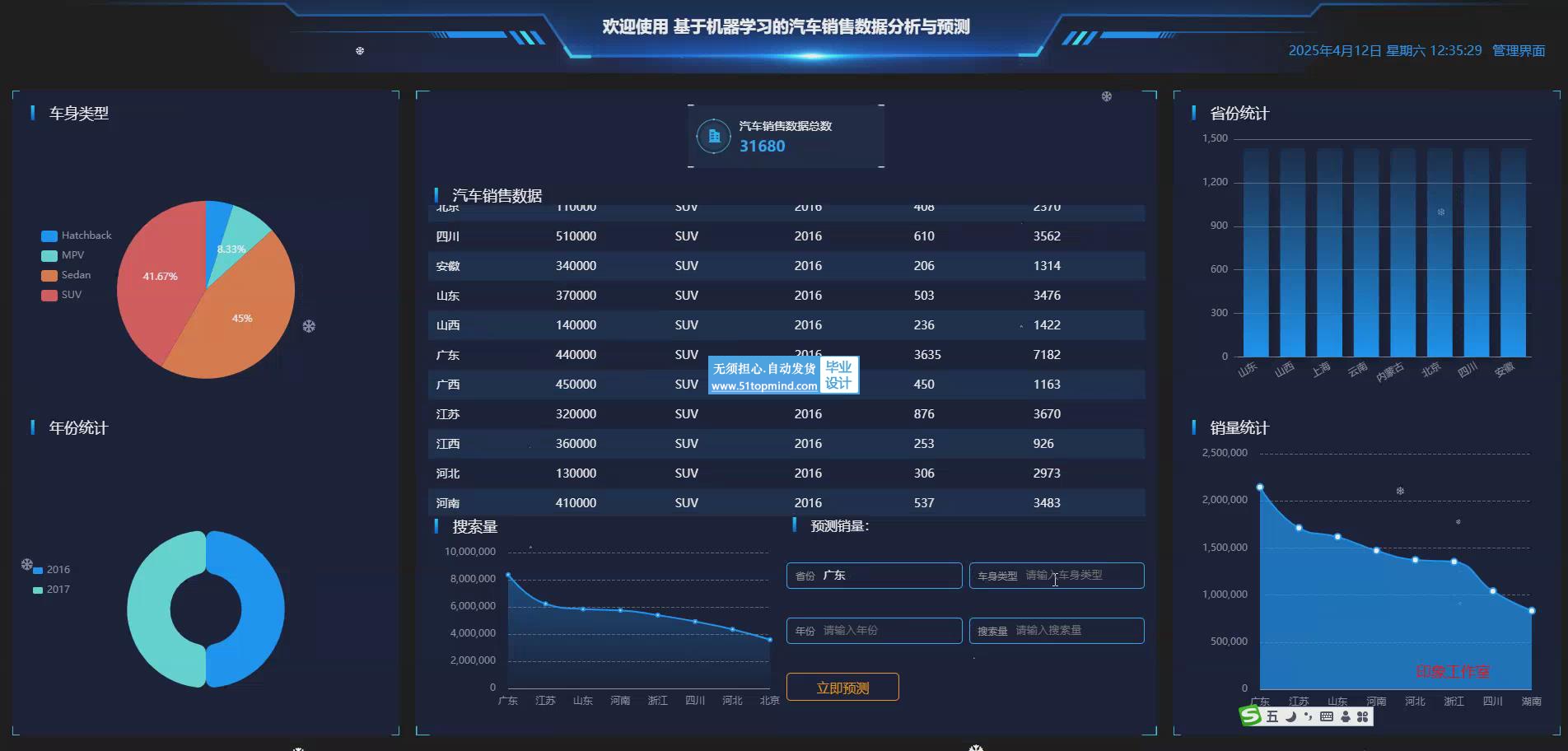 在本论文中,基于机器学习的汽车销售数据分析与预测系统被提出并实现。系统设计围绕着提高汽车销售数据管理效率,优化销售数据预测的准确性以及加强用户和管理员的互动性展开。论文首先从研究背景和意义入手,明确了在当今大数据与机器学习技术迅速发展的背景下,传统的汽车销售数据管理方式面临的挑战与局限。通过分析系统需求、系统架构及数据库设计,本论文展示了一个面向用户与管理员的完整汽车销售数据分析与预测平台。在用户端,系统支持查看汽车销售数据、公告资讯以及个人中心管理功能;管理员则可以通过系统进行销售数据的管理与修改、销售预测的查看与调整,以及公告资讯的发布与管理。系统整体基于Python语言开发,采用Django框架进行后端开发,前端使用Vue技术实现,数据存储则使用MySQL数据库,并通过机器学习算法进行销售数据的分析与预测。