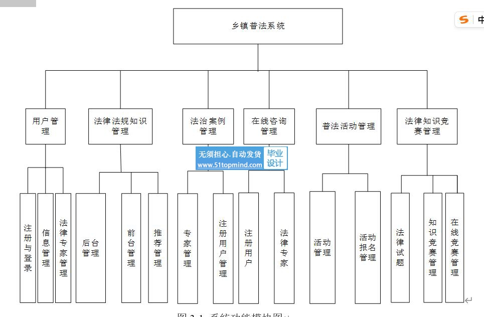 乡镇普法宣传系统的功能设计围绕普法宣传的核心目标展开,旨在为用户提供全面的法律知识学习、案例查看、在线咨询、活动参与和知识竞赛等功能。系统主要包括用户管理、法律法规知识管理、法治案例管理、在线咨询管理、普法活动管理和法律知识竞赛管理六大功能模块