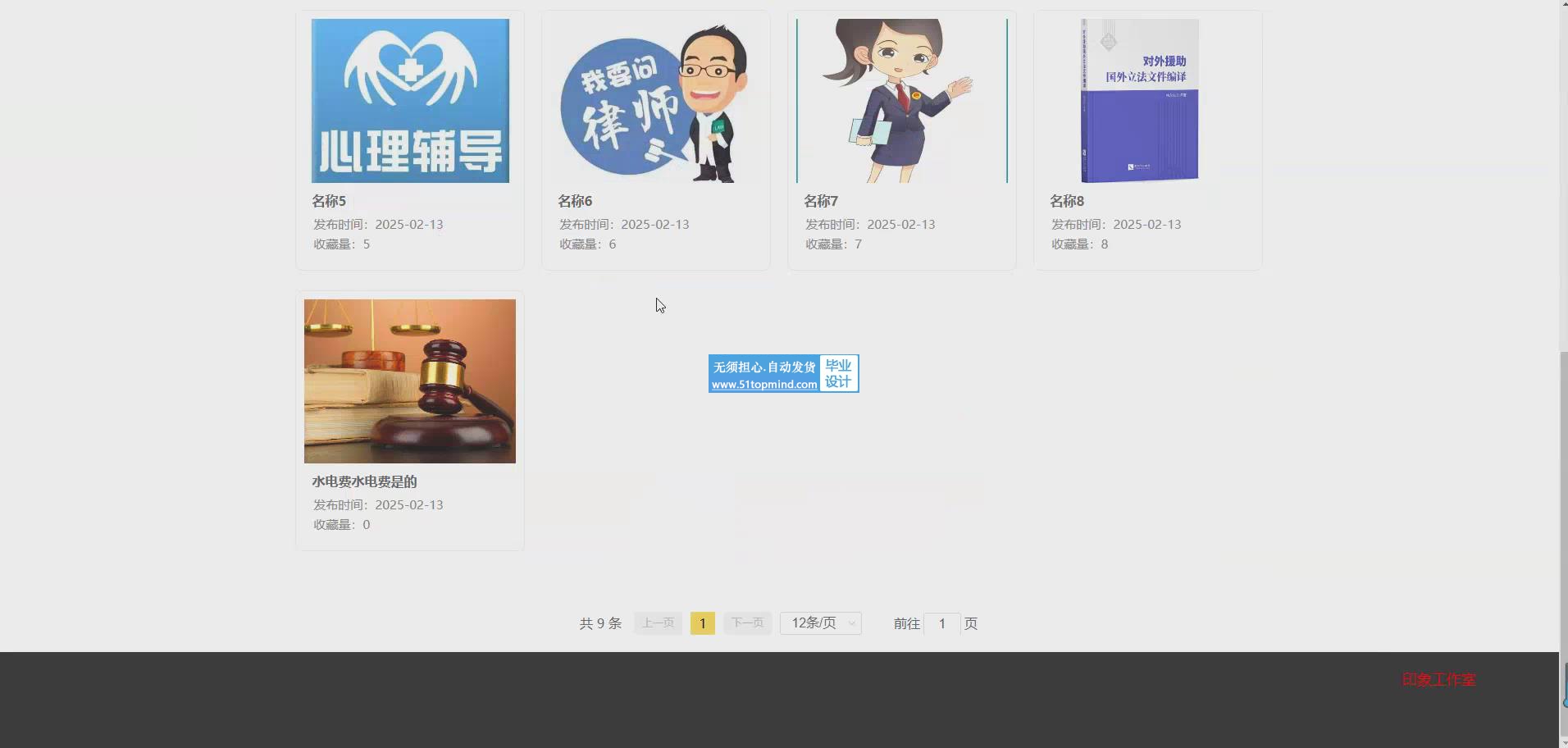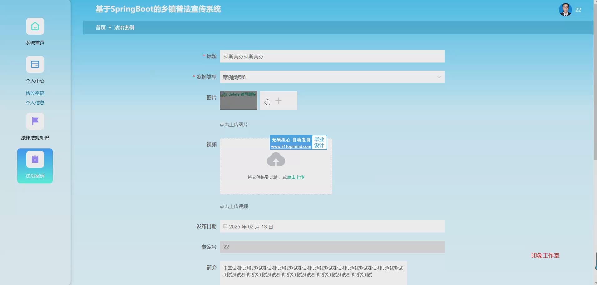 该系统基于SpringBoot、VUE以及MySQL技术构建,涵盖多类用户管理模块,实现用户注册、登录及信息管理。系统管理员可在后台管理用户数据与法律法规知识;前台为用户提供知识搜索、分类浏览与个性化推荐。法律专家能够上传法治案例,注册用户可进行在线咨询。此外,系统还设有普法活动与法律知识竞赛管理模块,实现活动创建、报名审核及考试记录生成等功能。
