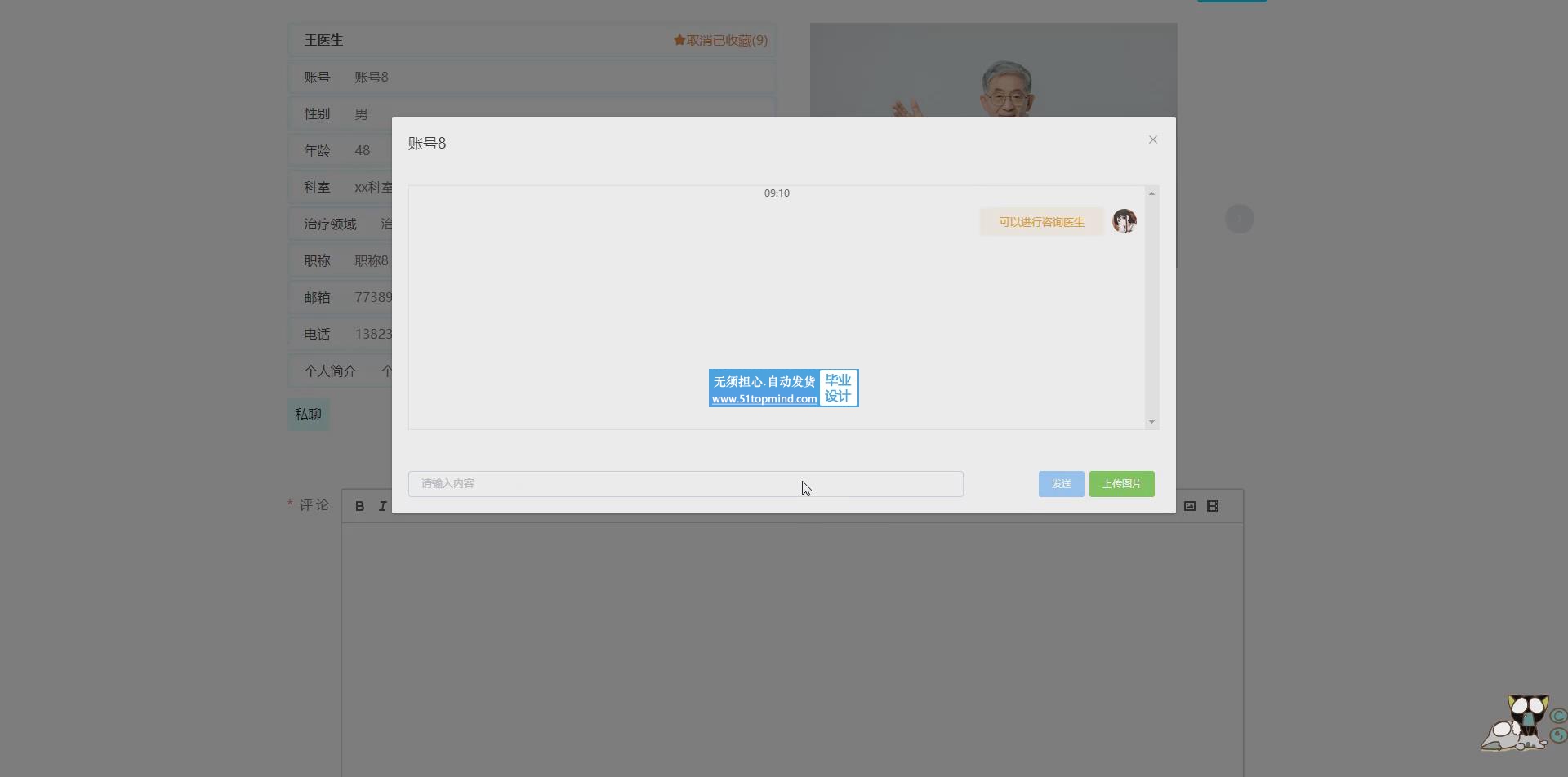该模块提供即时消息功能,支持文本和图像等多种消息类型,方便患者就其病情、药物问题等咨询医生。医生可以在私人聊天模块中查看患者的历史消息,以了解他们病情的变化和药物反馈。