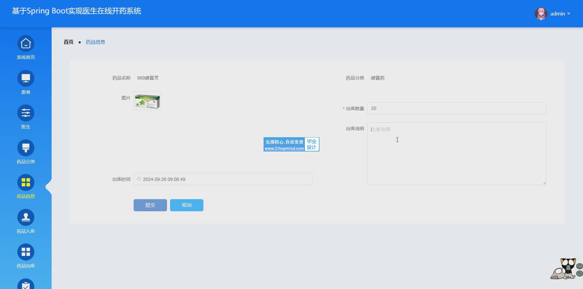 该软件包括前端开发、后端开发和数据库开发三个部分。以 Vue. js为基础进行前端的设计,以 SpringBoot为基础进行后端的设计,使用 MySQL作为数据库的管理体系。在后端开发中,Spring框架负责对象生命周期的管理,提供依赖注入和事务管理等核心功能。SpringMVC负责处理来自前端的请求,将请求分发至相应的处理方法,并将处理结果反馈给前端。在此基础上, MyBatis完成了对 SQL语句和 Java对象的映射,从而完成了对 SQL和 Java对象的映射。医生线上处方系统的主要功能包括病人管理、医生管理、药品管理、入库管理、出库管理、药方管理等。所有的功能都涵盖了处方信息的采集、编辑、发布、管理和检索等方面,为使用者提供了一个方便、有效的在线处方服务平台。