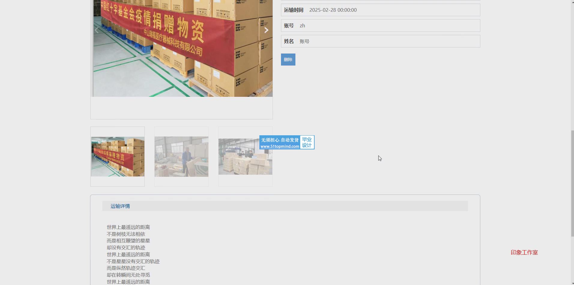 物资运输管理:管理员可管理运输任务,包括运输方式、运输路线、运输状态更新等,确保物资能够安全、快速地送达目标地区。