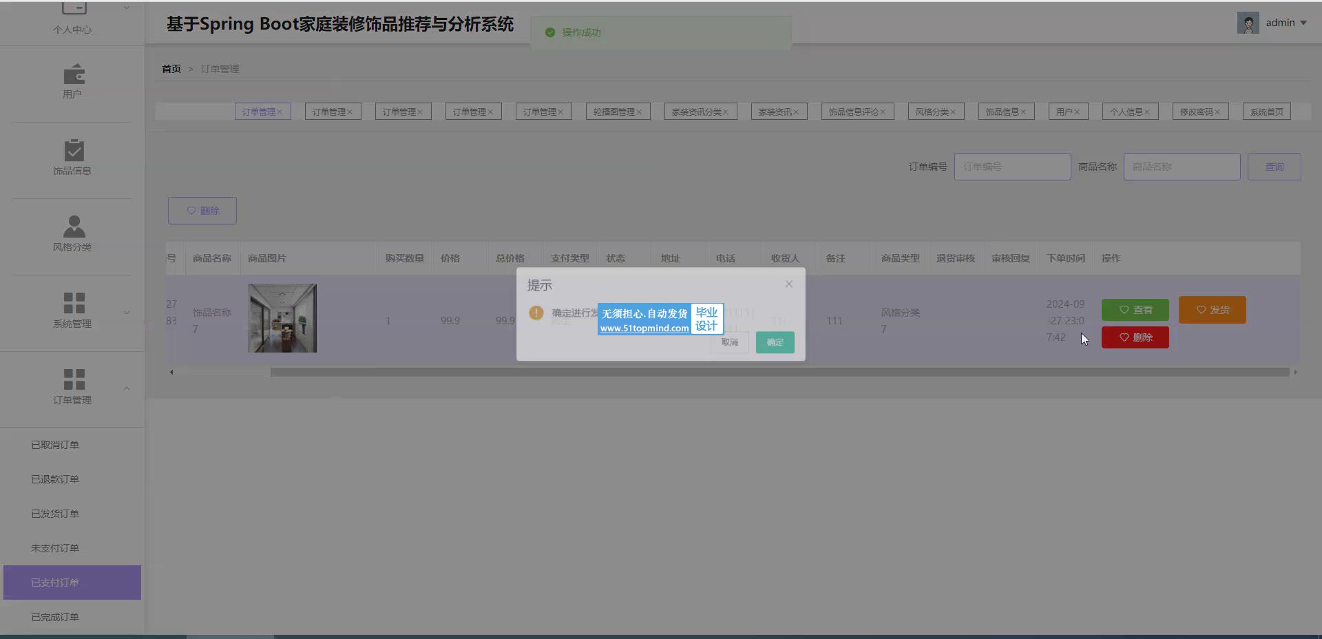 订单管理:展示所有订单的信息,包括订单号、购买时间、用户信息、商品信息、支付状态等。提供订单搜索功能,允许管理员根据订单号、购买时间、用户等条件筛选订单。允许管理员对订单进行发货、退款、取消等操作,并查看订单详情和物流信息。