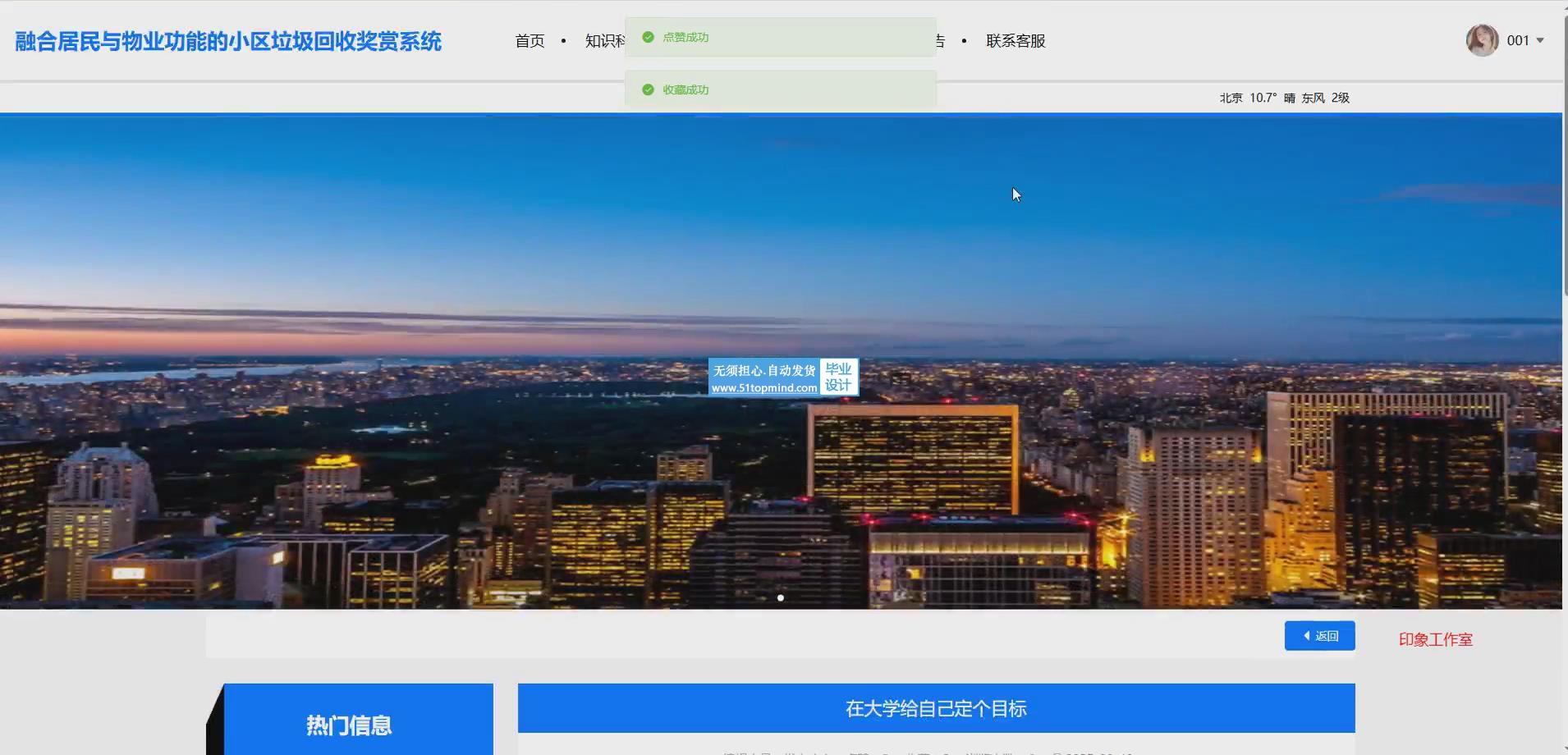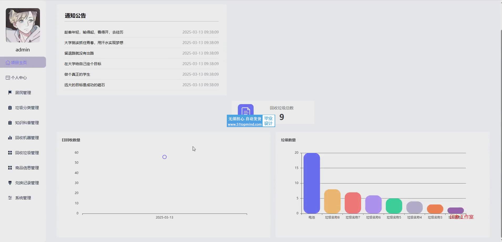 本研究开发的小区垃圾回收奖赏系统,旨在通过智能化手段提升垃圾分类回收效率和居民参与度。系统采用Spring Boot框架结合Vue前端,基于MySQL数据库实现用户和管理员功能。用户可查询知识科普、回收机器、商品信息,浏览通知公告,联系客服及管理个人中心;管理员可进行项目主页可视化管理、居民管理、垃圾分类管理、知识科普管理、回收机器管理、回收垃圾管理、商品信息管理、兑换记录管理和系统管理。系统测试表明功能稳定,操作便捷,满足设计需求,为小区垃圾回收管理提供了有效支持。