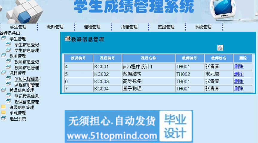 教师可以登录系统可以查询学生信息,查询自己教授的课程,添加和删除学生成绩信息;学生登录系统可以选课和查询自己的成绩;管理员登录系统可以对学生、教师、课程、授课、班级等信息进行管理,并可以修改密码。