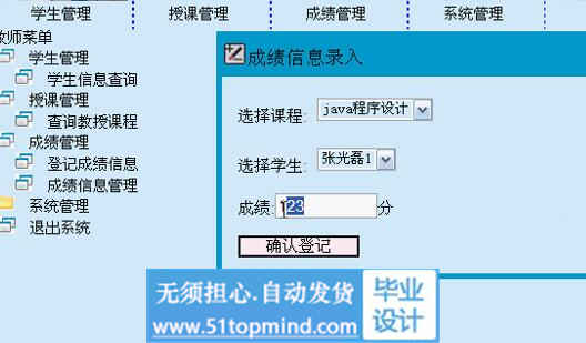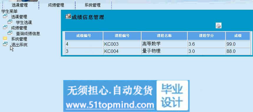 本系统是采用B/S模式进行开发的,系统的用户权限有三种:教师,学生和系统管理员,不同权限用户登入到不同的操作界面。该系统主要由学生管理、教师管理、成绩管理和选课管理等功能模块组成,本文具体介绍了各功能模块所包含的小模块的功能,学生管理模块主要是对学生的基本信息进行添加、查询、修改、删除;选课管理模块主要是学生对所修的课程进行添加、查看等;成绩管理模块主要是教师添加、删除成绩信息,学生查看成绩。