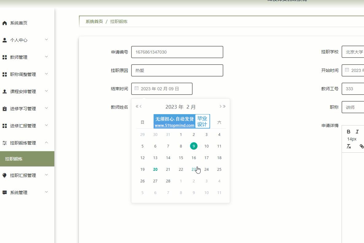 课题主要分为二大模块:即管理员模块和教师模块,主要功能包括:个人信息修改、专业信息、职称调整、课程安排、进修学习、进修汇报等功能;