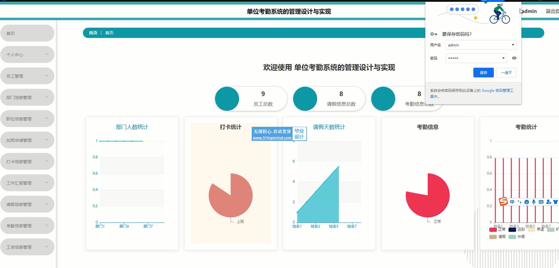 该单位考勤系统的管理设计与实现采用B/S架构、前后端分离以及MVC模型进行设计,并采用java语言以及Spring Boot框架进行开发。该系统主要设计并完成了管理过程中的员工登录、个人信息修改、加班申请、打卡信息、工作汇报、请假信息等功能。该系统操作简便,界面设计简洁,不但可以基本满足本行业的日常管理工作,同时又可以有效减少人员成本和时间成本,为单位考勤系统的管理工作提供了方便。