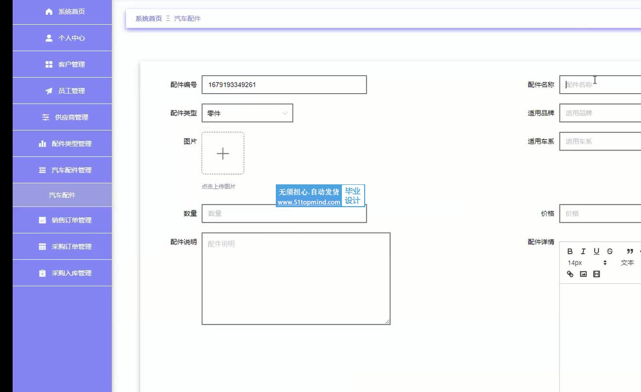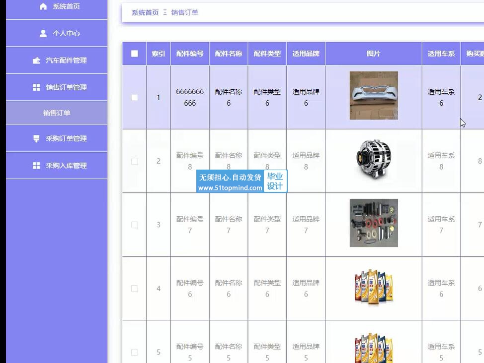 过对知识内容的学习研究,进而设计并实现一个基于JavaWeb的汽配销售管理系统。系统能实现的主要功能应包括;汽车配件、销售订单、采购订单、采购入库等的一些操作,ide工具:IDEA 或者eclipse