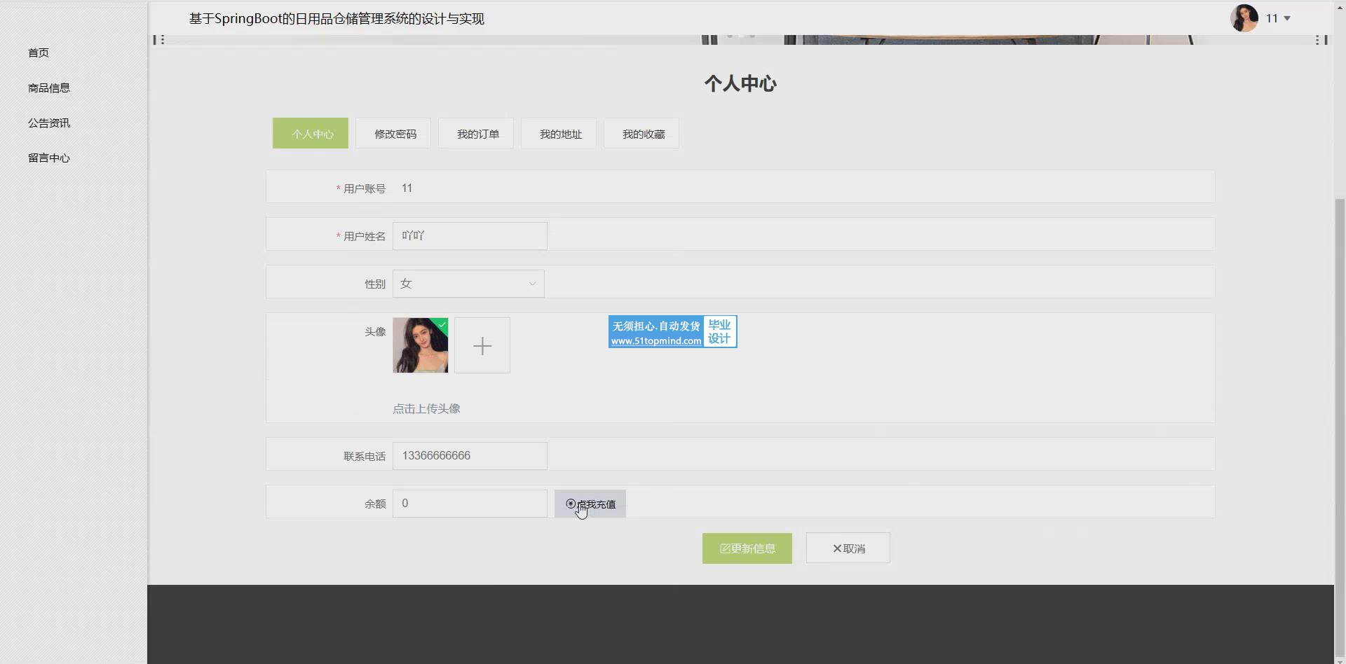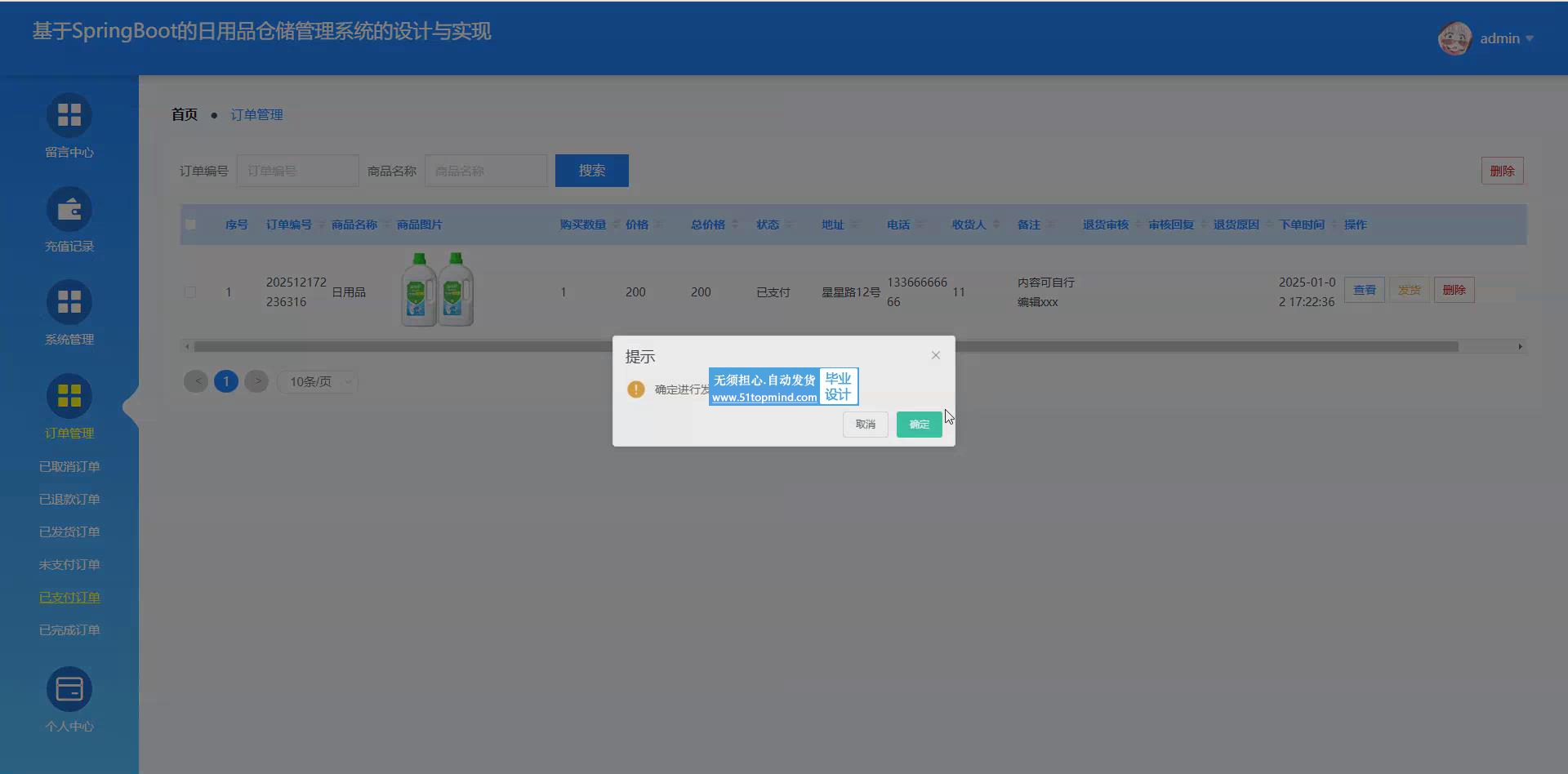 本研究的主要内容围绕日用品仓储管理系统的设计与实现展开,旨在解决传统仓储管理效率低下、数据不透明等问题。首先,通过需求分析明确系统的核心功能,包括商品分类管理、商品信息管理、入库管理、出库管理、库存监控及数据统计等。其次,基于SpringBoot框架设计系统架构,采用前后端分离模式,后端提供RESTful API,前端使用Vue.js实现交互界面,数据库选用MySQL存储数据。在功能实现上,重点开发了商品分类的多级管理、商品信息的增删改查、入库出库记录的实时更新、库存预警及盘点等功能,并通过数据统计模块生成可视化报表,为企业决策提供支持。此外,研究还涉及数据库表结构设计、系统性能优化及安全性测试,确保系统的高效性和可靠性。最后,通过实际应用验证系统的可行性和实用性,分析其在提升仓储管理效率、降低运营成本方面的效果,并展望未来引入人工智能、物联网等技术的可能性,为智能化仓储管理提供参考[6]。本系统采用SpringBoot框架作为后端开发基础,利用其简洁性、高效性和模块化设计思想,结合MySQL数据库进行数据存储与管理。在商品分类模块中,系统实现了对日用品的精细化分类,方便企业根据不同类型进行库存和销售统计。商品信息模块则详细记录了每个商品的基本信息,如名称、规格、价格等,为库存管理提供基础数据。入库信息模块记录了商品的进货信息,包括进货数量、进货时间等,确保库存数据的准确性。出库信息模块则跟踪了商品的销售和出库情况,为库存预警和补货决策提供依据。